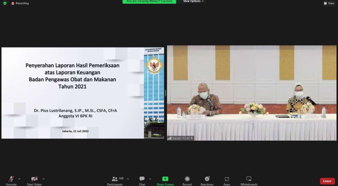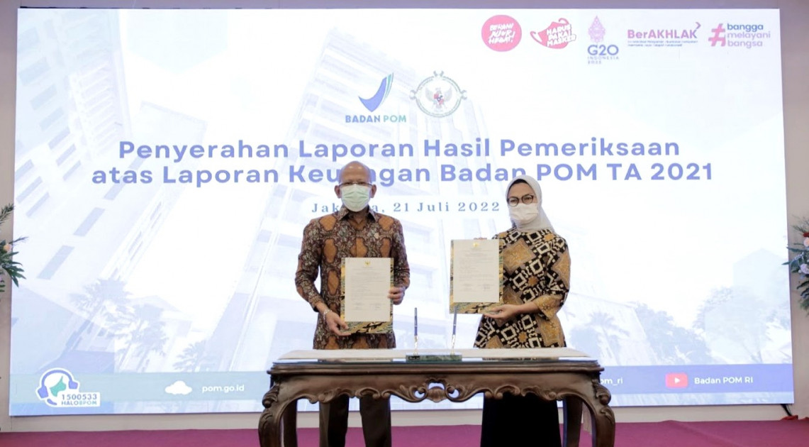 Jakarta – Badan POM kembali meraih opini Wajar Tanpa Pengecualian (WTP) berdasarkan hasil pemeriksaan Badan Pemeriksa Keuangan Republik Indonesia (BPK RI) atas Laporan Keuangan Tahun Anggaran 2021. Capaian ini disampaikan dalam Penyerahan Laporan Hasil Pemeriksaan (LHP) BPK di Aula Bhinneka Tunggal Ika Badan POM, pada Kamis (21/07/2022).