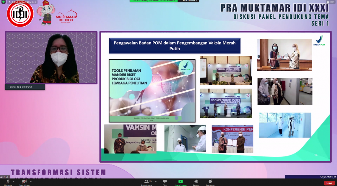 Badan POM terus melakukan langkah strategis dalam upaya percepatan penanganan pandemi COVID-19 dan terus mendukung industri farmasi serta lembaga penelitian dalam pemenuhan persyaratan produksi dan registrasi untuk pengembangan obat dan penemuan obat baru. Hal tersebut disampaikan oleh Direktur Pengawasan Produksi Obat, Narkotika, Psikotropika, dan Prekursor Badan POM, Togi Junice Hutadjulu yang mewakili Kepala Badan POM dalam acara Muktamar Ikatan Dokter Indonesia (IDI) XXXI pada Kamis (20/11/2022).