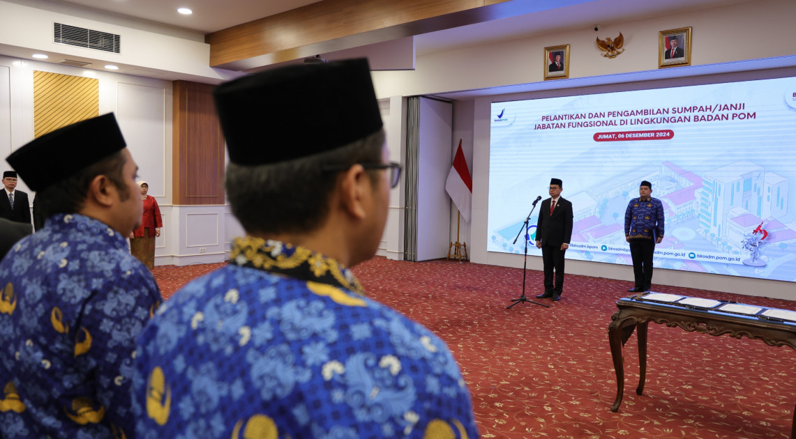 Jakarta – Kepala BPOM Taruna Ikrar melantik dan mengambil sumpah atau janji 88 pejabat fungsional di lingkungan BPOM di Jakarta, Jumat (6/12/2024). Pelantikan dan pengambilan sumpah ini merupakan hal penting bagi BPOM sebagai institusi untuk menunjang fungsi terdepan dalam pengawasan obat dan makanan.