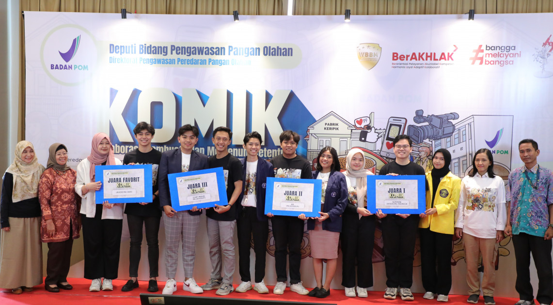 Bogor - Rabu (22/11/2023), BPOM mengumumkan pemenang Lomba Kolaborasi Membuat Iklan Memenuhi Ketentuan (KOMIK) yang telah dimulai sejak Juli 2023. Lomba KOMIK ini diikuti oleh sepuluh (10) pelaku usaha mikro, kecil, dan menengah (UMKM) pangan olahan dan tiga puluh (30) mahasiswa dari berbagai perguruan tinggi di wilayah Jabodetabek, yaitu Universitas Indonesia, IPB University, Universitas Sahid, dan Universitas Islam Negeri Syarif Hidayatullah.