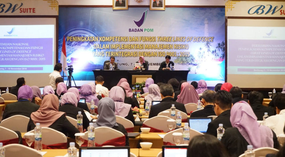 Belitung (08/11) - Manajemen risiko sebagai upaya peningkatan pengendalian intern selalu dilaksanakan oleh BPOM. Dari waktu ke waktu, upaya ini terus dilakukan untuk membangun kepercayaan dan memberikan pelayanan terbaik dengan memastikan setiap proses bisnis berjalan sesuai yang telah ditetapkan dan menindaklanjuti segala penyimpangan yang terjadi dengan segera. Pengendalian ini dilakukan oleh 3 tingkat lapis pertahanan yang dimiliki BPOM, yaitu Manajemen Representatif (MR), Auditor Internal (AI), serta Aparat Pengendali Intern Pemerintah (APIP) dalam hal ini Inspektorat Utama BPOM.