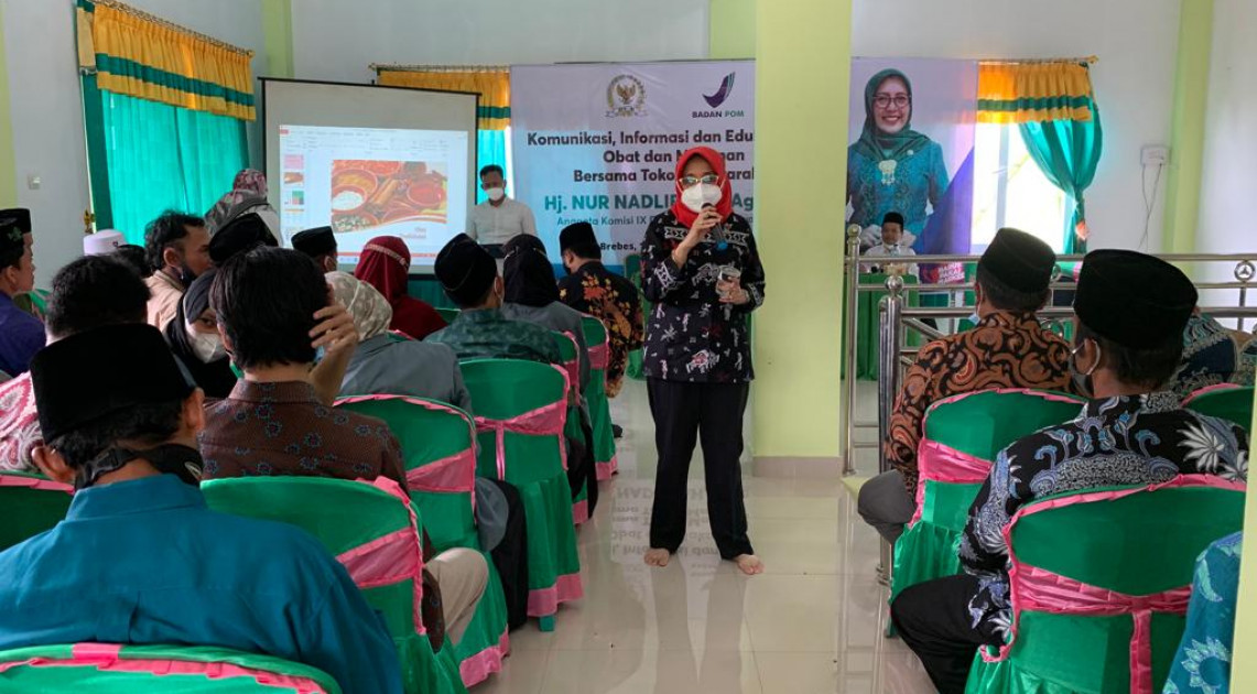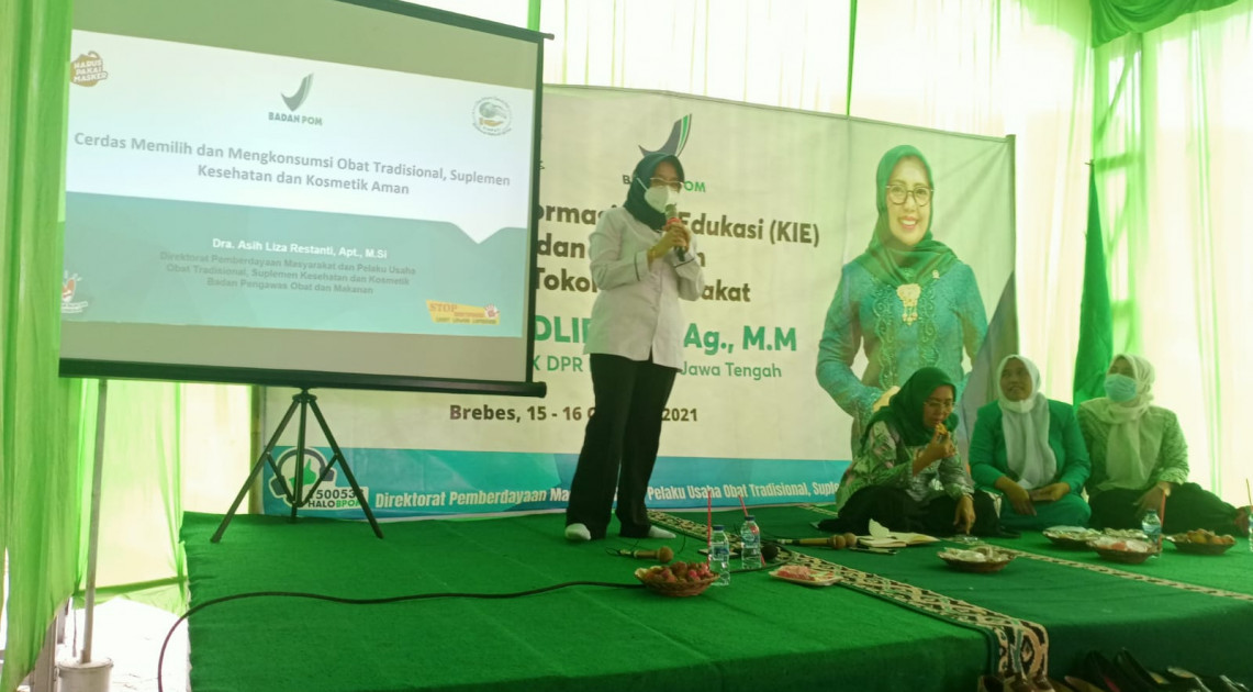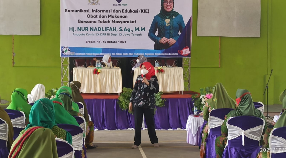 Dalam upaya mencerdaskan masyarakat Kabupaten Brebes menjadi konsumen yang cerdas, Direktur Pemberdayaan Masyarakat dan Pelaku Usaha Obat Tradisional, Suplemen Kesehatan dan Kosmetika melaksanakan kegiatan Komunikasi, Informasi dan Edukasi (KIE) bersama Tokoh Masyarakat pada Jumat dan Sabtu, 15-16 Oktober 2021. Pelaksanaan KIE ini dilakukan dengan protokol kesehatan yang ketat salah satunya dengan menggunakan masker, menjaga jarak dan jumlah peserta yang terbatas sehingga dilakukan di lima titik lokasi dengan jumlah peserta masing-masing 100 orang. Pada hari pertama kegiatan KIE dilaksanakan di aula Kecamatan Bantarkawung dan Madrasah Manaruk Huda, hari kedua pelaksanaan KIE bertempat di aula MTS Assalam, Gedung Majelis Wakil Cabang NU Salem dan SMA 1 Salem. Kegiatan ini juga didukung oleh Hj. Nur Nadlifah, S.Ag., M.M selaku tokoh masyarakat di daerah setempat yang turut menyampaikan imbauan kepada warga agar setiap ilmu yang diterima dari para Narasumber dapat diterapkan dalam kehidupan seharai-hari. Hj. Nur Nadlifah, S.Ag., M.M juga menghimbau warga selama pandemi ini untuk selalu menjaga protokol kesehatan dan mensukseskan program Vaksinasi Covid 19.