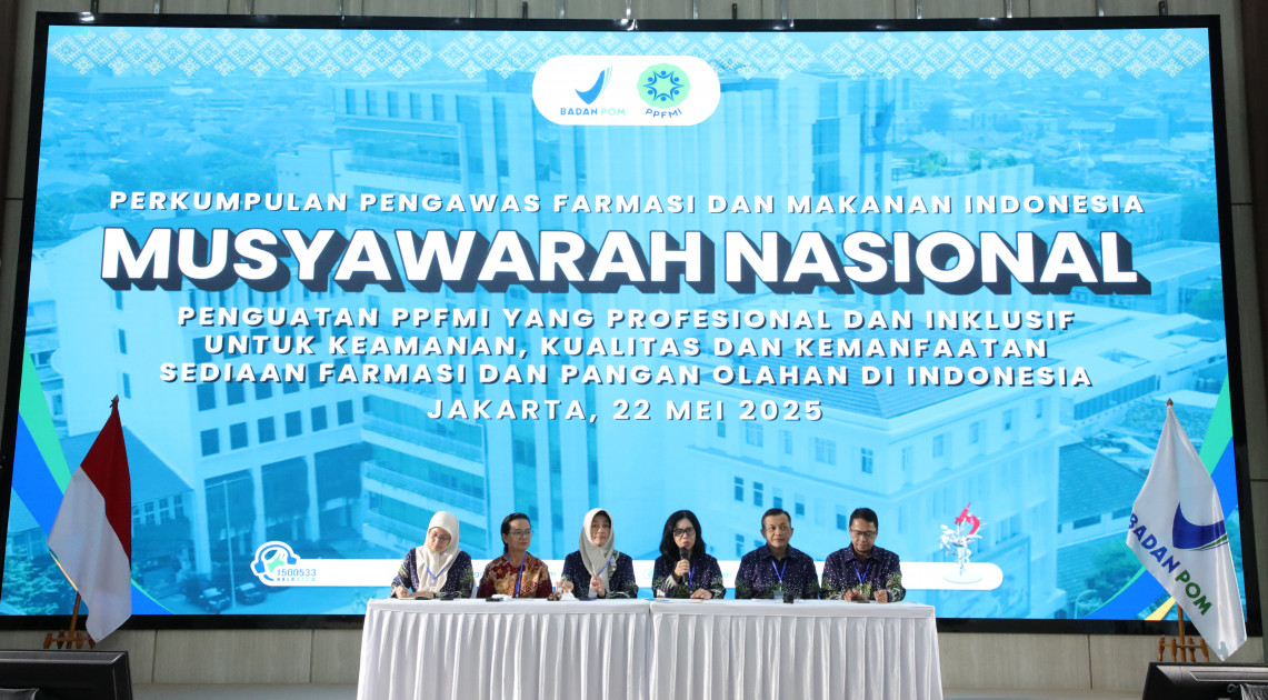 Jakarta – Musyawarah Nasional (Munas) Perkumpulan Pengawas Farmasi dan Makanan Indonesia (PPFMI) resmi digelar di Auditorium Gedung Merah Putih BPOM, Kamis (22/5/2025). Kegiatan dihadiri oleh 77 unit kerja perwakilan Pengawas Farmasi dan Makanan (PFM) di BPOM serta beberapa PFM inklusif yang ada di luar BPOM. Munas pertama ini mengusung tema "Penguatan PPFMI yang Profesional dan Inklusif untuk Keamanan, Kualitas, dan Kemanfaatan Sediaan Farmasi dan Pangan Olahan di Indonesia".