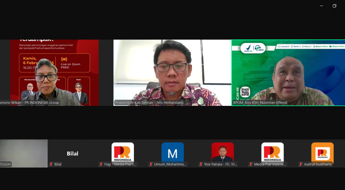 Jakarta – BPOM berpartisipasi pada kegiatan webinar yang bertajuk “Anggaran Makin Cekak, Komunikasi Publik Bakal Terdampak?” pada Kamis (6/2/2025). Kepala Biro Kerja Sama dan Hubungan Masyarakat (Biro KSHM) Noorman Effendi menjadi salah satu pembicara dalam kegiatan yang diselenggarakan oleh PR Indonesia berkolaborasi dengan Humas Indonesia. Talkshow ini hadir untuk mendiskusikan isu terkini mengenai pemotongan anggaran yang terjadi di berbagai sektor pemerintah, salah satunya kehumasan, dalam rangka efisiensi.