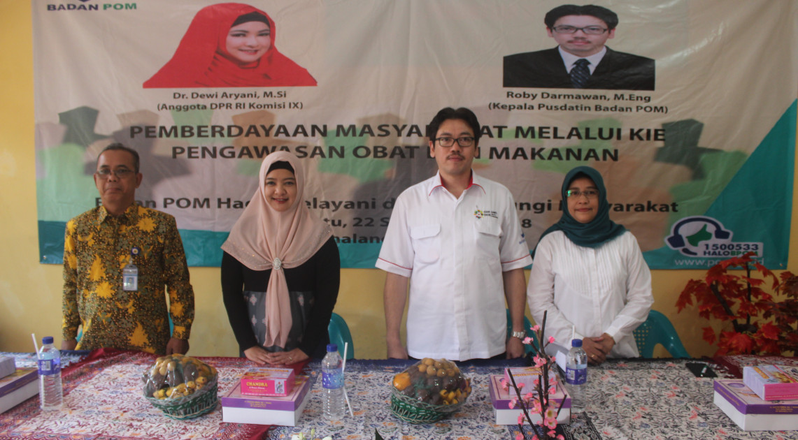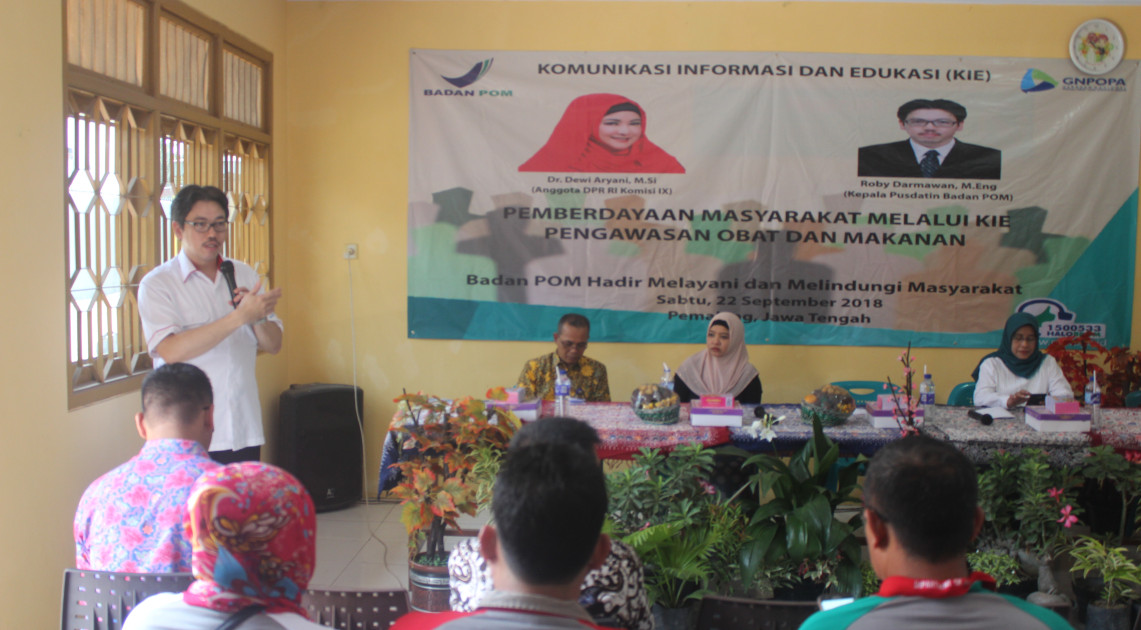 Pusat Data dan Informasi Obat dan Makanan bersama Balai Besar POM di Semarang serta lintas sektor terkait, berupaya untuk memberikan edukasi kepada masyarakat melalui kegiatan Komunikasi Informasi dan Edukasi (KIE) dengan mengagngkat tema "Pemberdayaan Masyarakat Melalui KIE Pengawasan Obat dan Makanan". Kegiatan tersebut diselenggarakan pada tanggal 22 September 2018 di kota Pemalang dengan salah satu narasumber anggota Komisi IX DPR RI, Dra. Dewi Aryani,M.Si.