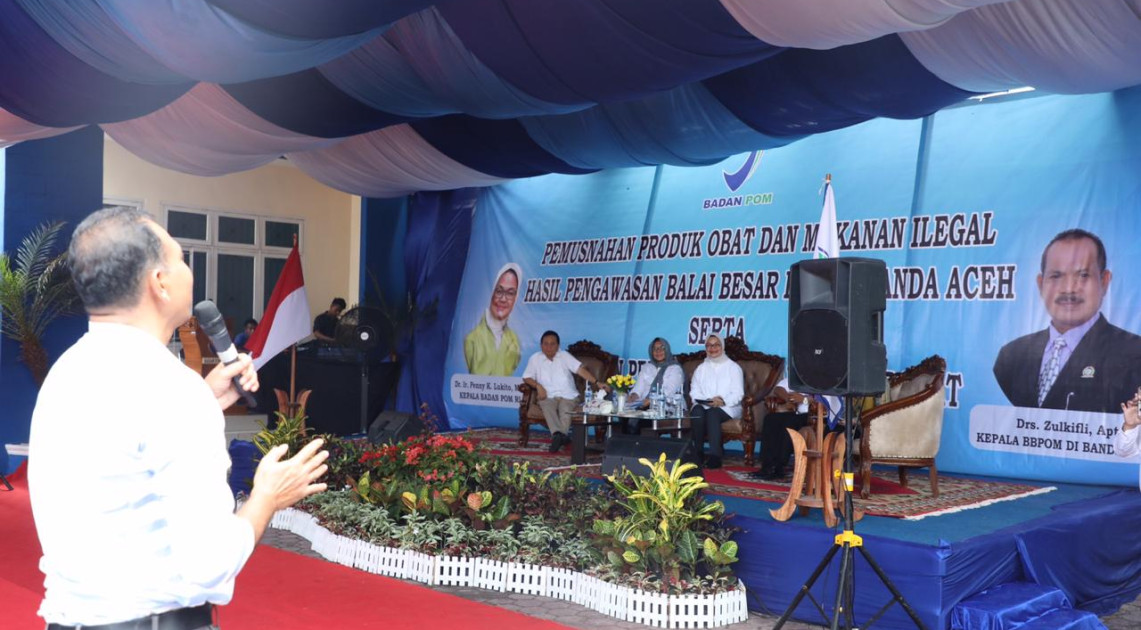 Banda Aceh - Untuk lebih dekat dengan masyarakat dan pelaku usaha terutama Usaha Mikro, Kecil, dan Menengah (UMKM), Badan POM melakukan edukasi kepada masyarakat tentang cerdas memilih obat dan makanan, Rabu (20/03). Bertempat di kantor Balai Besar POM (BBPOM) di Aceh, selain memberikan edukasi kepada masyarakat, Kepala Badan POM, Penny K. Lukito juga berdialog interaktif dengan UMKM setempat yang selama ini mendapatkan bimbingan dan pendampingan dari Balai Besar POM di Banda Aceh.