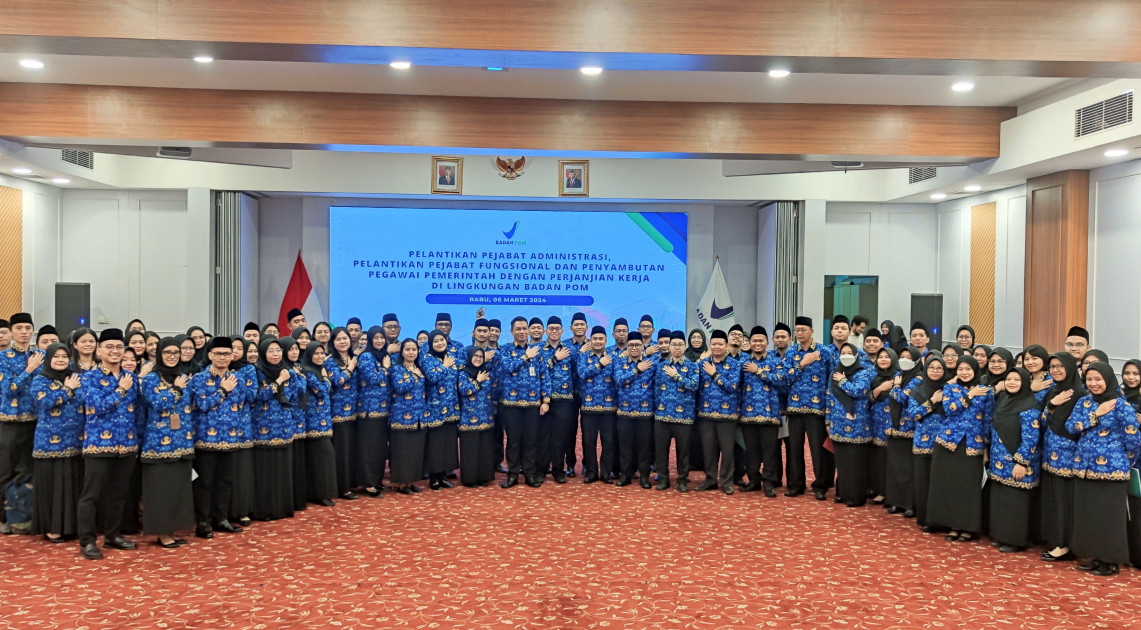 Jakarta - Pelaksana Tugas (Plt.) Kepala BPOM RI, L Rizka Andalusia melantik 1.042 pegawai di lingkungan BPOM pada Rabu (06/03/2024). Bertempat di Aula Bhinneka Tinggal Ika dan juga diikuti secara daring oleh pegawai yang dilantik, pelantikan dilakukan untuk 2 pejabat administrator (Kepala Bagian Tata Usaha) di Balai Besar POM dan 4 pejabat pengawas (Kepala Subbagian Tata Usaha) di Balai POM baru. Selain itu, juga dilantik 524 pejabat fungsional dan dilakukan penyambutan bagi 512 Pegawai Pemerintah dengan Perjanjian Kinerja (PPPK) Tahun Anggaran 2022 dan 2023 di BPOM.