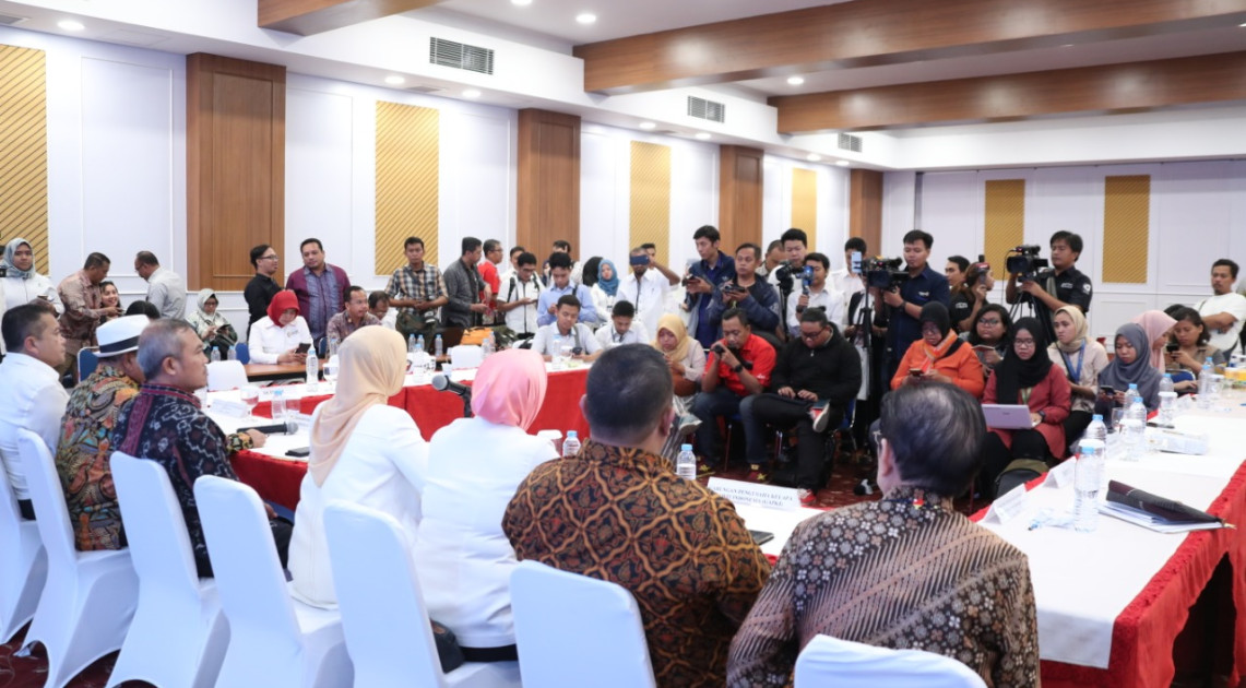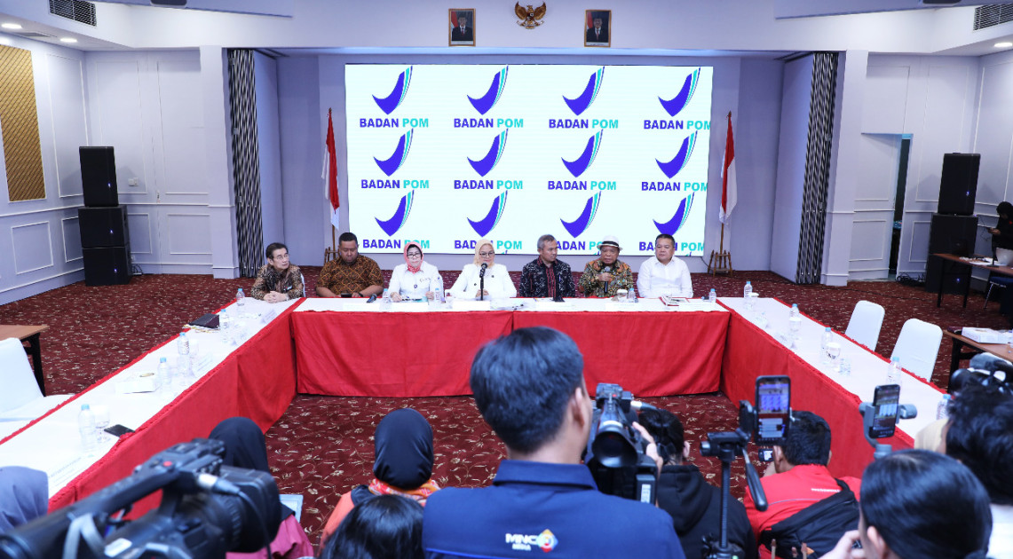 Jakarta – Bertempat di Aula Gedung C Badan POM, Rabu (21/08) Kepala Badan POM RI, Penny K. Lukito bersama Deputi Bidang Koordinasi Kesehatan Kemenko PMK, Agus Suprapto; Direktur Pengawasan Barang Beredar dan Jasa Kementerian Perdagangan, Ojak Simon Manurung; Ketua Umum Dewan Minyak Sawit Indonesia (DMSI), Derom Bangun; serta Gabungan Pengusahan Kelapa Sawit Indonesia (GAPKI), Agam Fatcurrochman memberikan keterangan kepada media usai mengadakan pertemuan terkait penanganan isu Palm Oil Free yang menjadi salah satu permasalahan industri kelapa sawit di Indonesia saat ini.