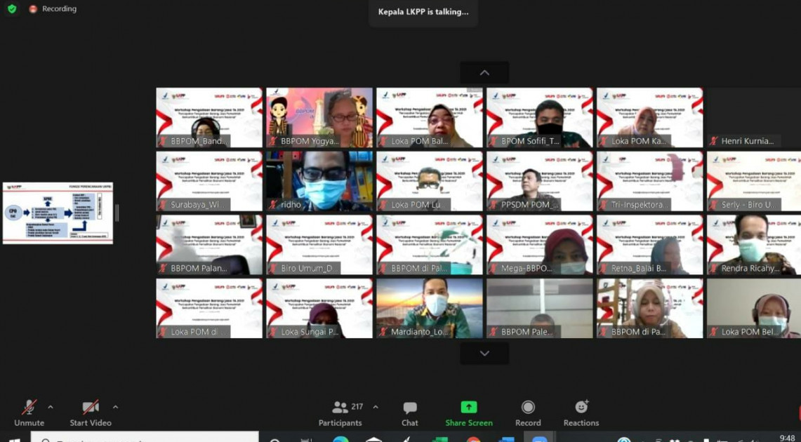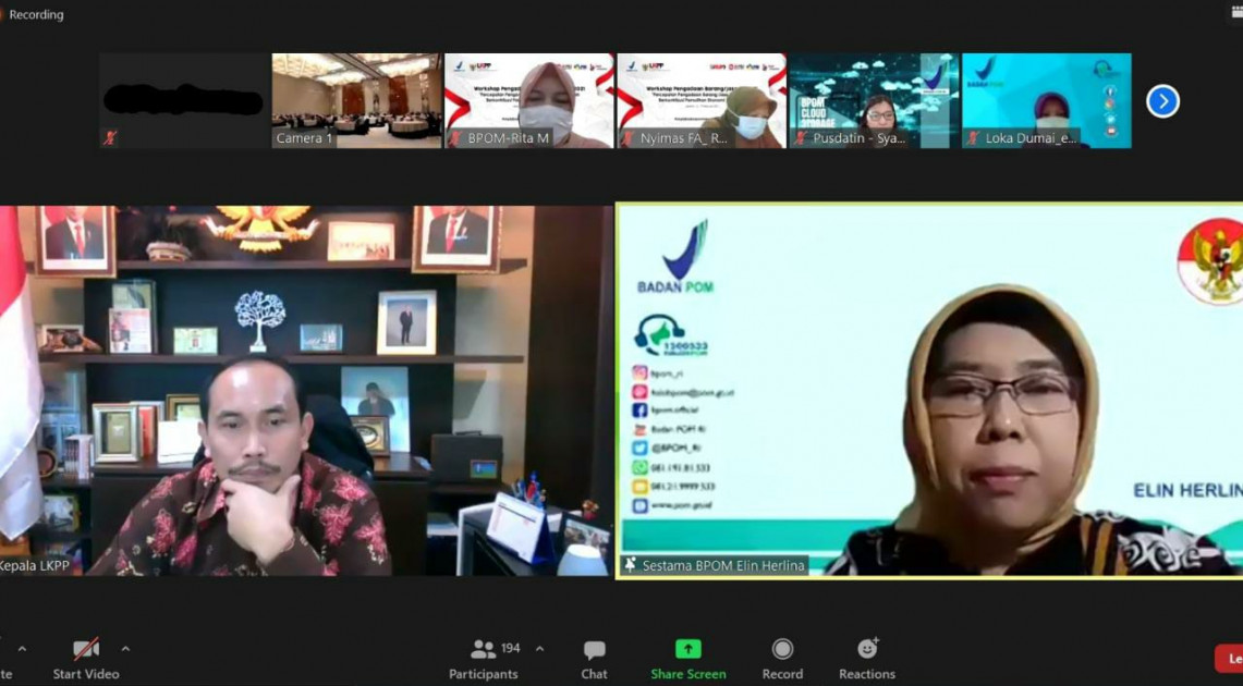 Jakarta – Selasa (16/02), Badan POM menyelenggarakan Workshop Pengadaan Barang/Jasa Badan POM Tahun Anggaran 2021. Acara tersebut dihadiri oleh Kuasa Pengguna Anggaran (KPA) dan Pejabat Pembuat Komitmen (PPK) yang menangani pengadaan barang/jasa di lingkungan Badan POM, termasuk 15 Kepala Loka POM yang telah menjadi Satuan Kerja Mandiri pada tahun 2021. Sekretaris Utama Badan POM, Elin Herlina, menyampaikan bahwa workshop ini bertujuan sebagai evaluasi kinerja Unit Kerja Pengadaan Barang/Jasa (UKPBJ) dan Kelompok Kerja (Pokja) pada tahun anggaran 2021, koordinasi dan konsolidasi internal antara UKPBJ dengan Pelaku Pengadaan, Profesionalisme SDM UKPBJ, dan Mitigasi Risiko Pengadaan Barang/Jasa.