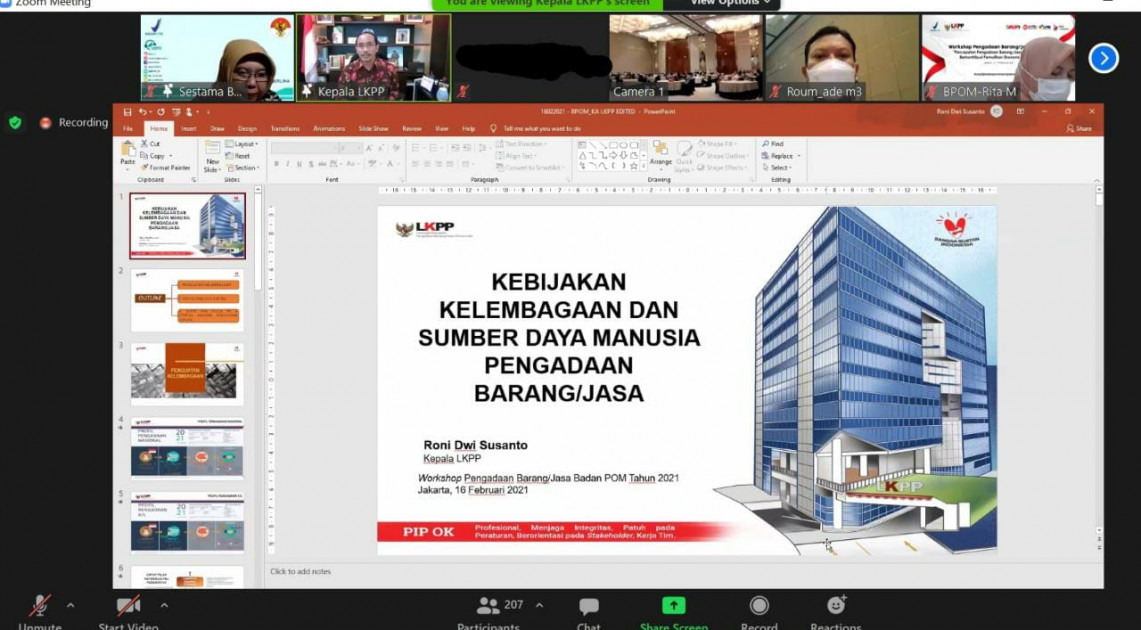 Selain itu, dalam menjalankan efisiensi birokrasi, ada dua aspek yang perlu ditekankan, yaitu penguatan kelembagaan dan SDM. Kepala LKPP, Roni Dwi Susanto, menyampaikan bahwa Badan POM menempati posisi proaktif, yaitu posisi ketiga dari 5 posisi dalam kematangan UKPBJ. Posisi proaktif tersebut masih perlu perbaikan dalam aspek proses, kelembagaan, SDM, dan sistem informasi. Lebih lanjut beliau menyampaikan bahwa paradigma kelembagaan hari ini harus berorientasi pada customer, artinya seluruh proses dalam pengadaan harus mengedepankan hasil yang dapat memberi manfaat bagi masyarakat.