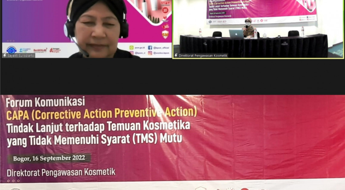 Untuk meningkatkan kesadaran dan pemahaman pelaku usaha dalam menindaklanjuti temuan produk yang tidak memenuhi syarat (TMS) mutu, Direktorat Pengawasan Kosmetik menyelenggarakan kegiatan “Forum Komunikasi CAPA (Corrective Action Preventive Action) Tindak Lanjut terhadap Temuan Kosmetika yang Tidak Memenuhi Syarat (TMS) Mutu” pada tanggal 16 September 2022 di Bogor, Jawa Barat. Dalam forum komunikasi ini menghadirkan Dra. Reri Indriani, Apt, M.Si selaku Deputi Bidang Pengawasan Obat Tradisional, Suplemen Kesehatan dan Kosmetik, Sri Sayekti Sulisdiarto (praktisi ahli CPKB) dan Dede Kusniati (praktisi industri kosmetika) serta diikuti oleh 30 pelaku usaha kosmetika dari wilayah Jabodetabek.