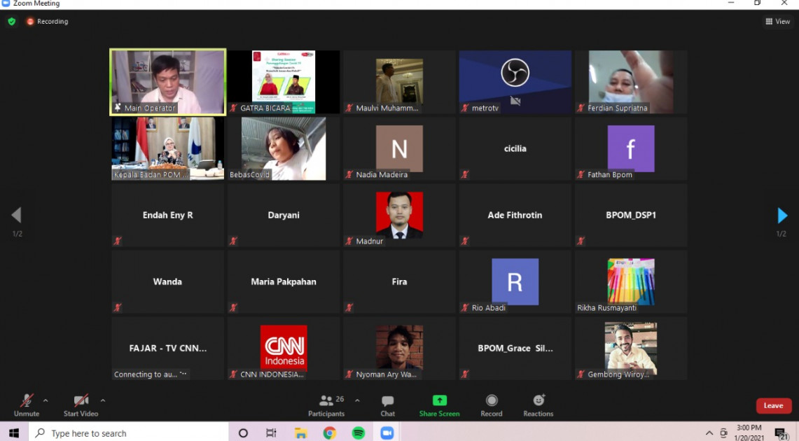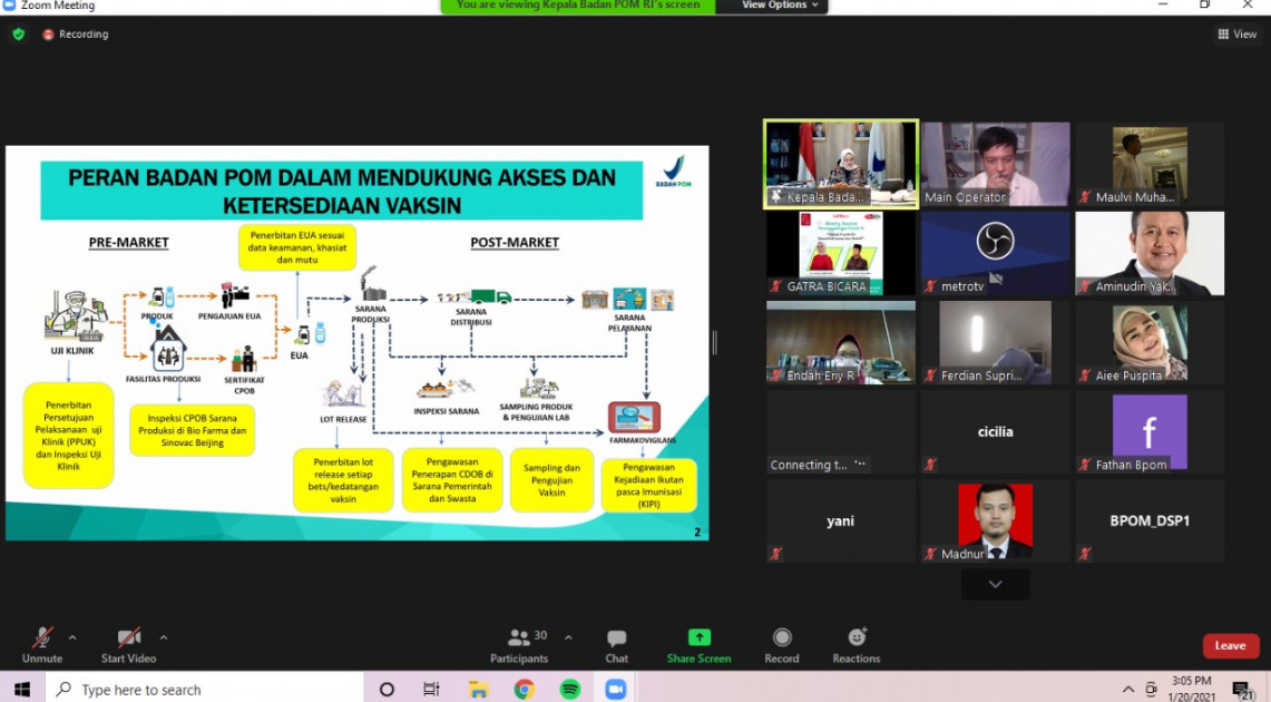 Kepala Badan POM RI, Penny K. Lukito menegaskan evaluasi vaksin sampai terbitnya EUA vaksin COVID-19 dilakukan Badan POM dengan profesional, independen, transparan dan menjunjung integritas. "Kredibilitas Badan POM telah diakui secara internasional dengan level maturitas 3 dan 4 dari skala 4 untuk 9 fungsi regulatori berdasarkan WHO Global Benchmarking Assessment 2018," jelasnya dalam sharing session secara daring "Vaksin COVID-19: Benarkah Aman dan Halal?" yang diselenggarakan Gatra Media Group, Rabu (20/01).