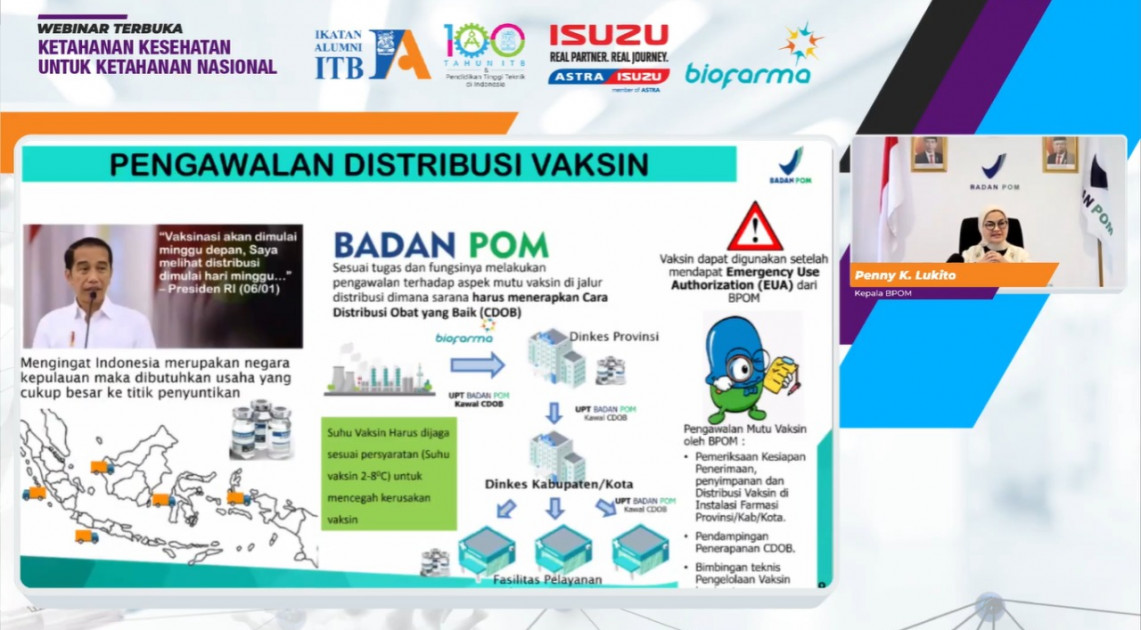 Jakarta – Kepala Badan POM RI, Penny K. Lukito bersama Menteri Kesehatan Budi Gunadi Sadikin, Direktur Utama PT Bio Farma Honesti Basyir dan Ketua Umum Ikatan Alumni ITB Ridwan Djamaluddin hadir sebagai narasumber dalam forum Webinar Terbuka Ikatan Alumni ITB melalui zoom, Sabtu (16/01). Acara yang juga ditayangkan live melalui youtube ini mengambil tema “Ketahanan Kesehatan untuk Ketahanan Nasional” yang sedang hangat diikuti perkembangannya oleh masyarakat Indonesia.