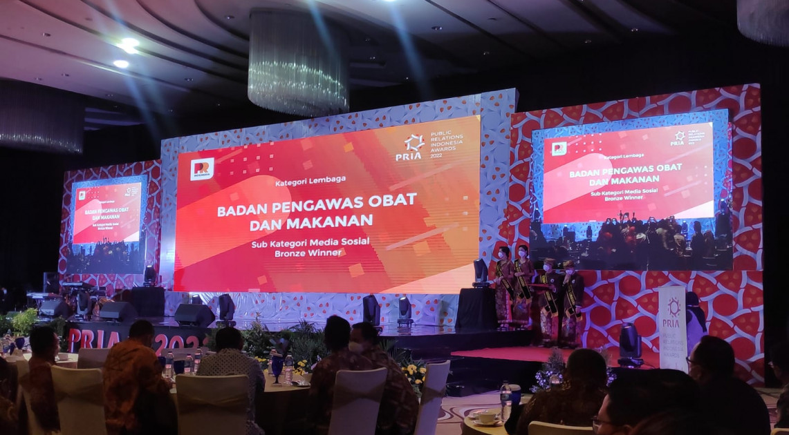 Semarang - Media Sosial Badan POM mendapatkan penghargaan berupa Bronze Winner dari ajang PR Indonesia Awards (PRIA 2022), Jumat (25/03/2022). Apresiasi ini diberikan langsung oleh CEO PR INDONESIA, Asmono Wikan kepada Badan POM pada malam penganugerahan PRIA 2022. Jika pada tahun-tahun sebelumnya Badan POM secara berturut mendapatkan penghargaan khusus sebagai Lembaga Terpopuler di Media, pada tahun ini Media Sosial Badan POM yang mendapatkan penghargaan PRIA 2022.