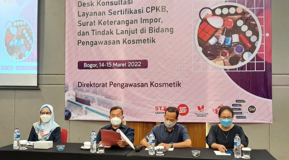 Kosmetik termasuk sediaan farmasi yang digunakan sehari-hari dan perubahan trend bergerak sangat dinamis. Oleh karena itu, Direktorat Pengawasan Kosmetik Desk Konsultasi Layanan Sertifikasi CPKB, Surat Keterangan Impor, dan Tindak Lanjut Di Bidang Pengawasan Kosmetik. Acara ini diselenggarakan pada hari Senin – Selasa, 14 – 15 Maret 2022 di Bogor Jawa Barat. Kegiatan yang berbentuk desk konsultasi ini dilaksanakan secara luring dengan menerapkan protokol kesehatan (prokes) yang ketat antara lain wajib menggunakan masker, menjaga jarak dan swab antigen sebelum memasuki ruangan. Kegiatan ini melibatkan 83 peserta yang merupakan perwakilan pelaku usaha kosmetik di wilayah Bogor dan sekitarnya.