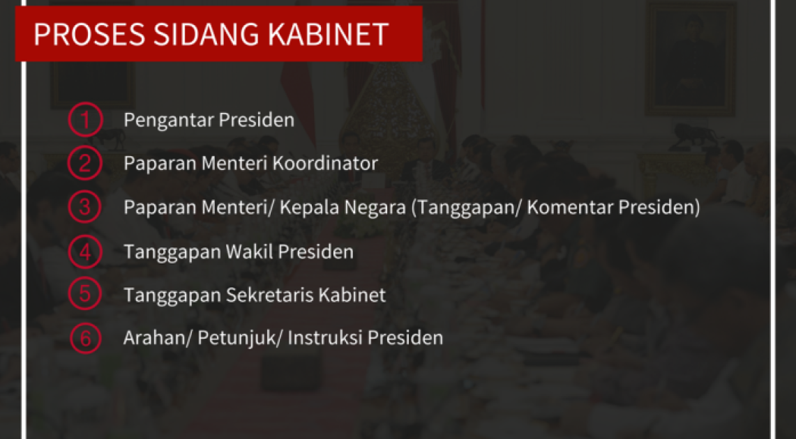 Setiap keputusan yang dihasilkan harus disampaikan kepada publik dan terdokumentasi dalam Keppres maupun Perpres. Inilah yang menjadi tanggung jawab Sekretariat Kabinet. Sebagaimana diatur dalam Perpres Nomor 25 tahun 2015, Sekretariat Kabinet mempunyai tugas untuk memberikan dukungan pengelolaan manajemen kabinet kepada Presiden dan Wakil Presiden dalam penyelenggaraan pemerintahan. Salah satu fungsinya adalah penyiapan, pengadministrasian, penyelenggaraan dan pengelolaan sidang kabinet, rapat atau pertemuan yang dipimpin/atau dihadiri oleh Presiden dan/atau Wakil Presiden.