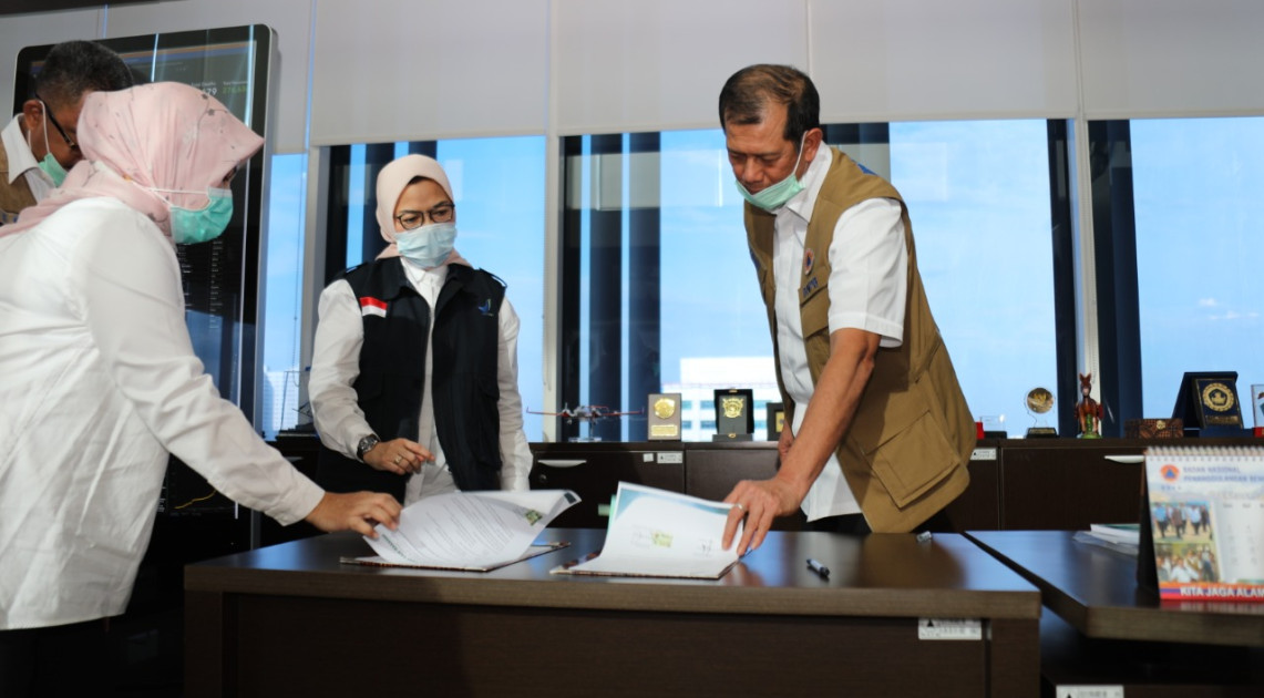 Jakarta – Selasa (07/04), Kepala Badan POM RI, Penny K. Lukito menyerahkan bantuan terkait percepatan penanganan COVID-19 kepada Kepala Badan Nasional Penanggulangan Bencana (BNPB), Letnan Jenderal Doni Monardo selaku Ketua Gugus Tugas Percepatan Penanganan COVID-19 di kantor BNPB Jakarta. Bantuan yang diserahkan merupakan hasil penggalangan dari berbagai perusahaan Obat dan Makanan melalui program Corporate Social Responbility (CSR) berupa obat-obatan, obat herbal, obat topikal, suplemen penambah daya tahan tubuh, vitamin, susu, minuman, dan alat kesehatan (antiseptik, hand sanitizer, hand soap, hand gel, masker serta sarung tangan)