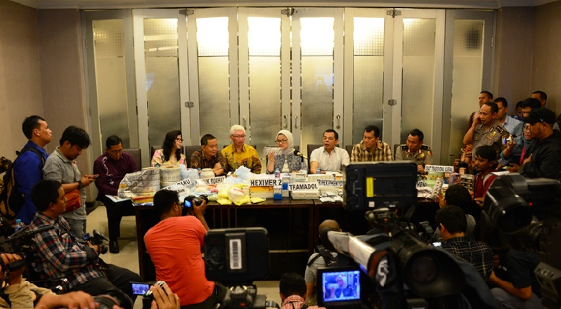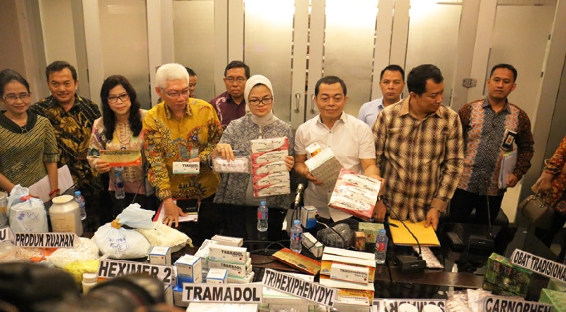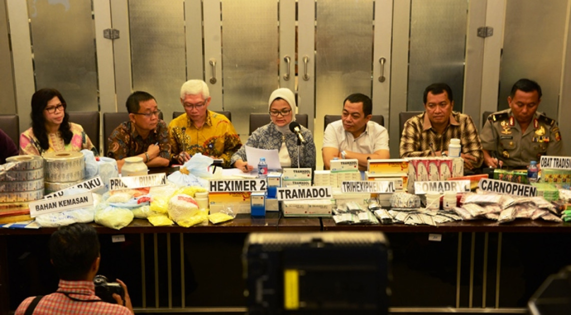 (06/09) Bertempat di aula Bareskrim Mabes POLRI, Kepala Badan POM bersama Wakil Kepala Bareskrim melakukan konferensi pers terkait penggerebekan lima gudang obat ilegal pada tanggal 2 September di Balaraja, Tangerang - Banten.