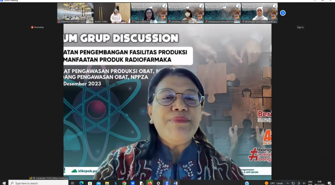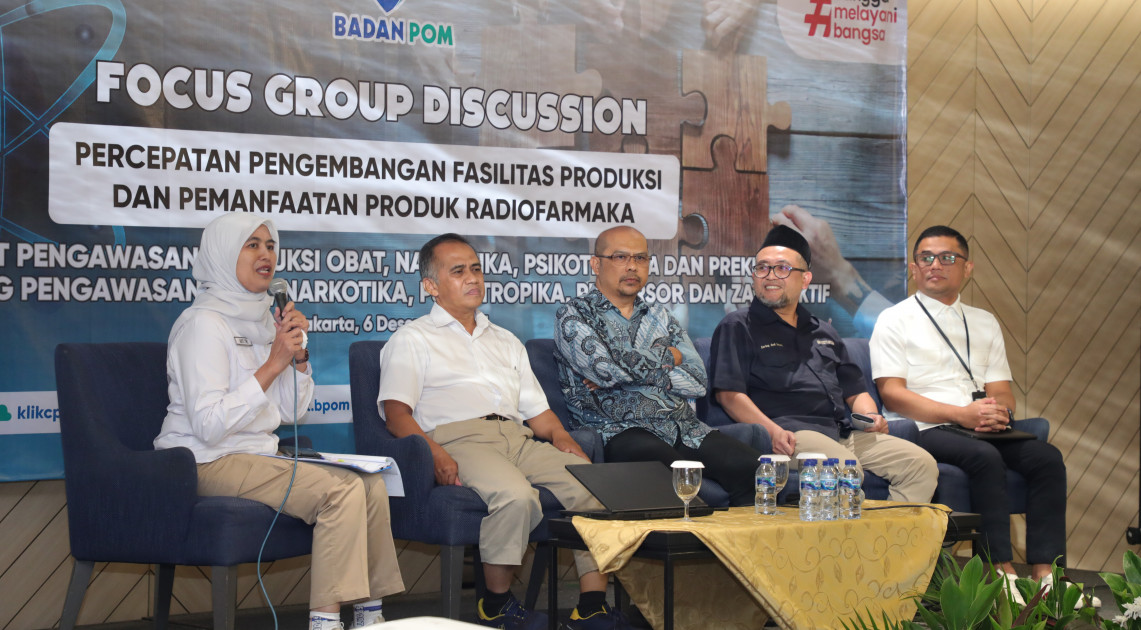 Jakarta – BPOM terus memberikan dukungan dalam penggunaan produk radiofarmaka produksi dalam negeri yang memenuhi standar keamanan, mutu, dan khasiat. Hal ini seiring dengan meningkatnya kebutuhan diagnosis dan pengobatan penyakit yang memanfaatkan produk radiofarmaka. Salah satu bentuk dukungan yang dilakukan, yaitu melalui kegiatan Focus Group Discussion (FGD) Percepatan Pengembangan Fasilitas Produksi dan Pemanfaatan Produk Radiofarmaka yang diselenggarakan Rabu (6/12/2023).