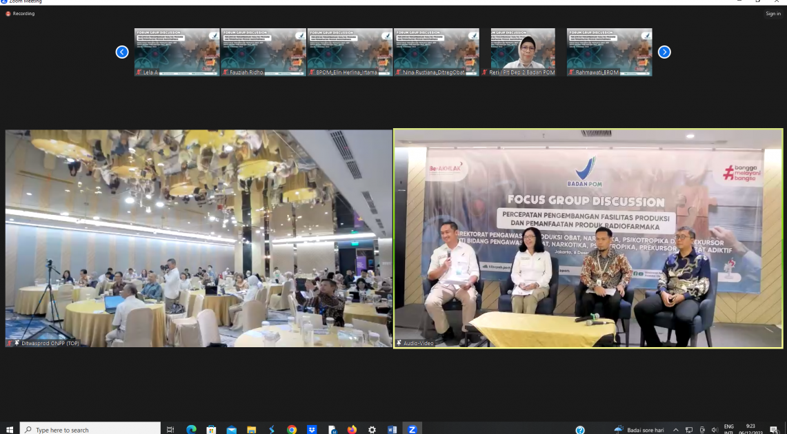 Kegiatan FGD Percepatan Pengembangan Fasilitas Produksi dan Pemanfaatan Produk Radiofarmaka berlangsung dalam dua sesi. Sesi pertama mengangkat topik Peran Pemerintah Dalam Mendukung Pengembangan Fasilitas Radiofarmaka. Sesi ini menghadirkan narasumber Plt. Deputi Bidang Pengawasan Obat, Narkotika, Psikotropika, Prekursor, dan Zat Adiktif BPOM; perwakilan dari Kementerian Kesehatan, Bapeten, dan Therapeutic Goods Administration (TGA) Australia.