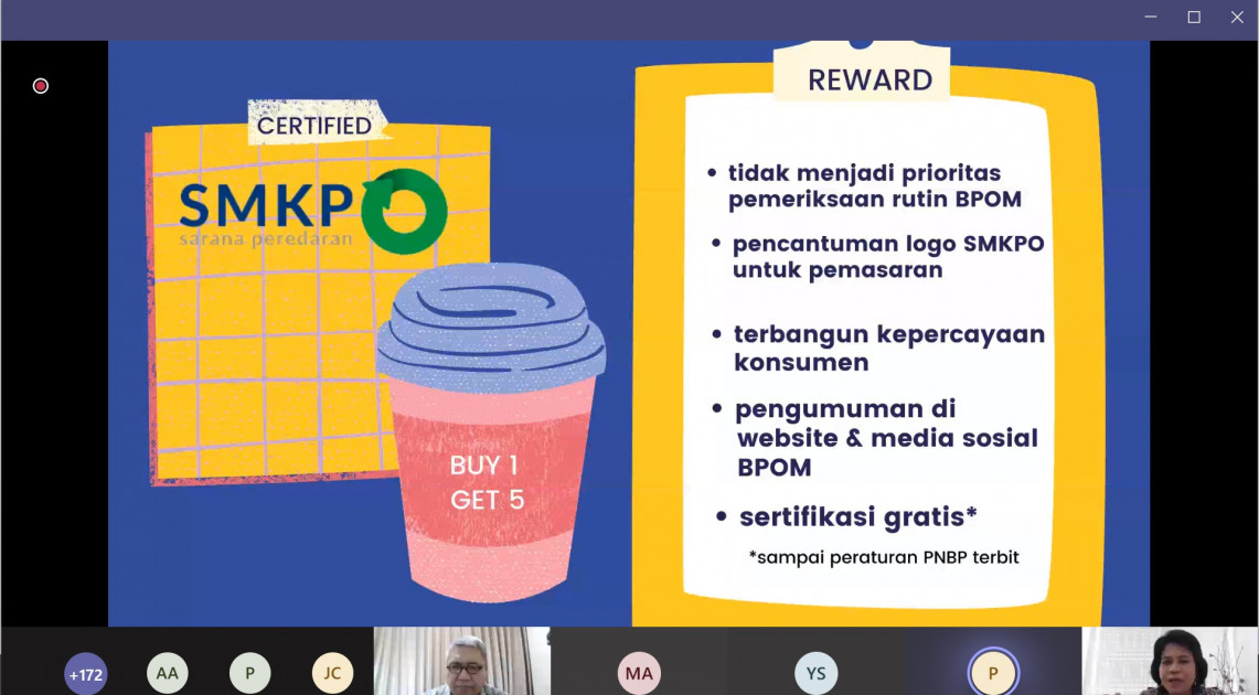 Deputi Bidang Pengawasan Pangan Olahan, Rita Endang menjelaskan berbagai keuntungan yang diperoleh pelaku usaha setelah menerapkan SMKPO. Salah satunya dalam hal membangun kepercayaan konsumen. “Melalui sertifikasi SMKPO, diharapkan pelaku usaha dapat melakukan penjaminan terhadap keamanan dan mutu pangan yang dijual/diedarkan secara mandiri dan berkelanjutan,” paparnya.