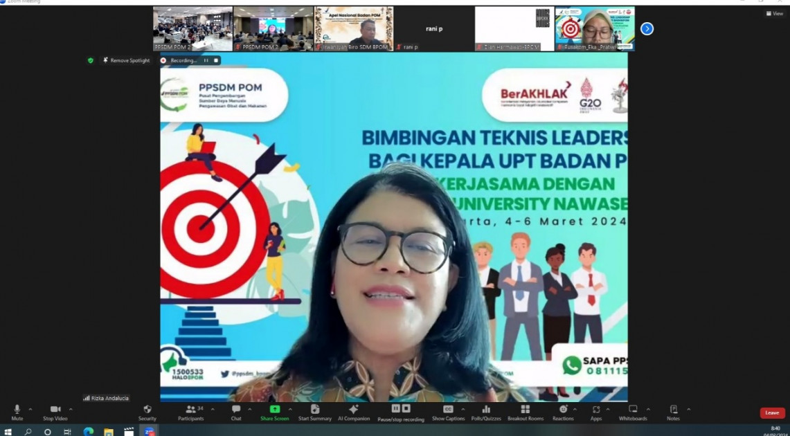 Jakarta – “Seorang Kepala UPT bertanggung jawab terhadap kinerja UPT yang dipimpinnya. Bapak/Ibu harus dapat memastikan perencanaan, pelaksanaan, monitoring, hingga evaluasi program kegiatan UPT terlaksana on the right track.” Berikut penegasan yang diutarakan Pelaksana Tugas (Plt.) Kepala BPOM RI, L Rizka Andalusia saat memberikan arahannya pada kegiatan Bimbingan Teknis (Bimtek) Leadership tahun 2024 bagi Pimpinan Unit Pelaksana Teknis (UPT) BPOM yang diadakan secara hybrid (offline dan online), Senin (04/03/2024).