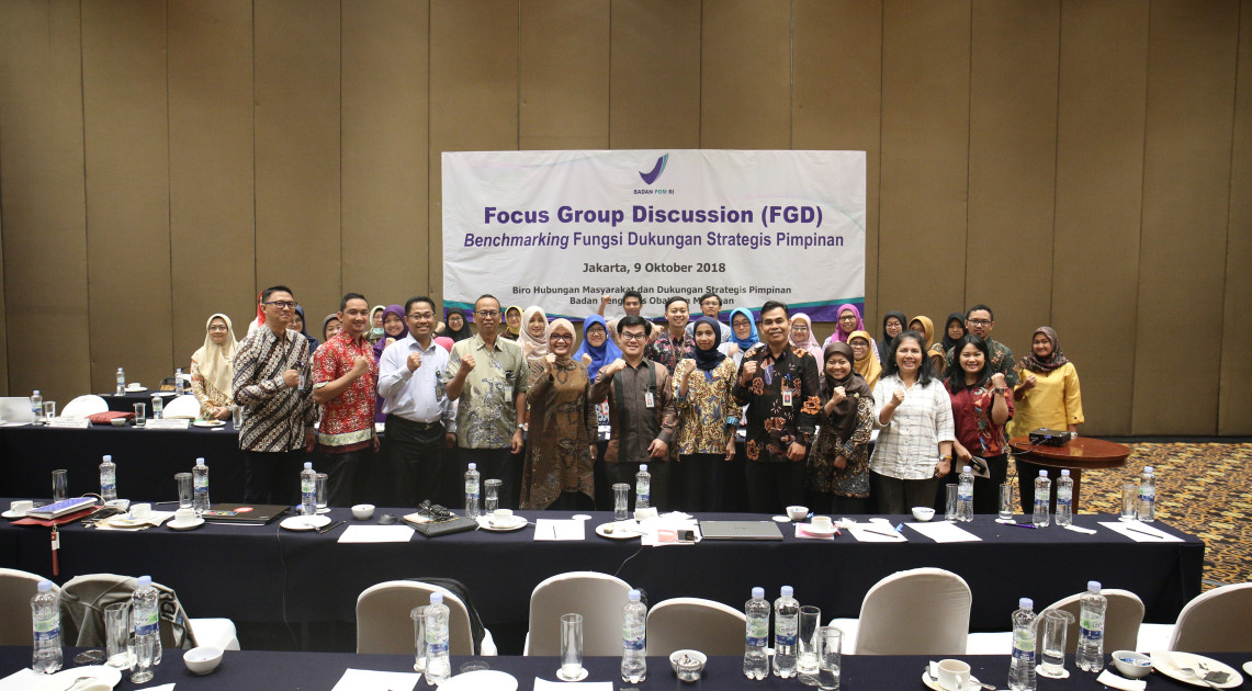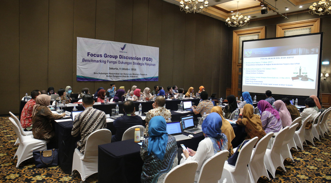 Untuk mempertajam dan memperkuat fungsi dukungan strategis pimpinan di BPOM, Bagian DSP sebagai unit baru membutuhkan masukan dari unit di Kementerian/Lembaga (K/L) lain yang mempunyai tugas yang sama. Hal inilah yang menjadi latar belakang diselenggarakannya FGD benchmarking Dukungan Strategis Pimpinan (09/10) di Hotel Aryaduta, Jakarta. FGD ini bertujuan untuk memperoleh informasi pelaksanaan fungsi penyiapan bahan pimpinan dan monitoring tindak lanjut arahan/ penugasan serta program/ kegiatan strategis pimpinan di K/L sebagai benchmark dalam penguatan fungsi dukungan strategis pimpinan yang handal di BPOM.