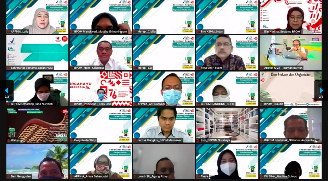 Jakarta – Badan POM menyelenggarakan Sosialisasi Regulasi Pangan Olahan Untuk Keperluan Medis Khusus (PKMK) secara online, Selasa (06/10). Kegiatan yang dibuka oleh Deputi Bidang Pengawasan Pangan Olahan, Rita Endang ini bertujuan menyamakan pemahaman dan persepsi terkait regulasi PKMK.