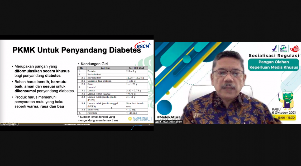 Senada dengan penjelasan tersebut, Prof. Ari menjelaskan lebih lanjut bahwa pengawasan dokter dalam pemberian PKMK kepada pasien bertujuan agar PKMK yang dikonsumsi oleh pasien aman, bermutu, dan sesuai tujuan konsumsi. Misalnya, pada kasus pasien diabetes, maka PKMK yang diberikan harus memiliki standar gizi yang tepat, terutama dari segi kandungan karbohidrat dan glukosa.