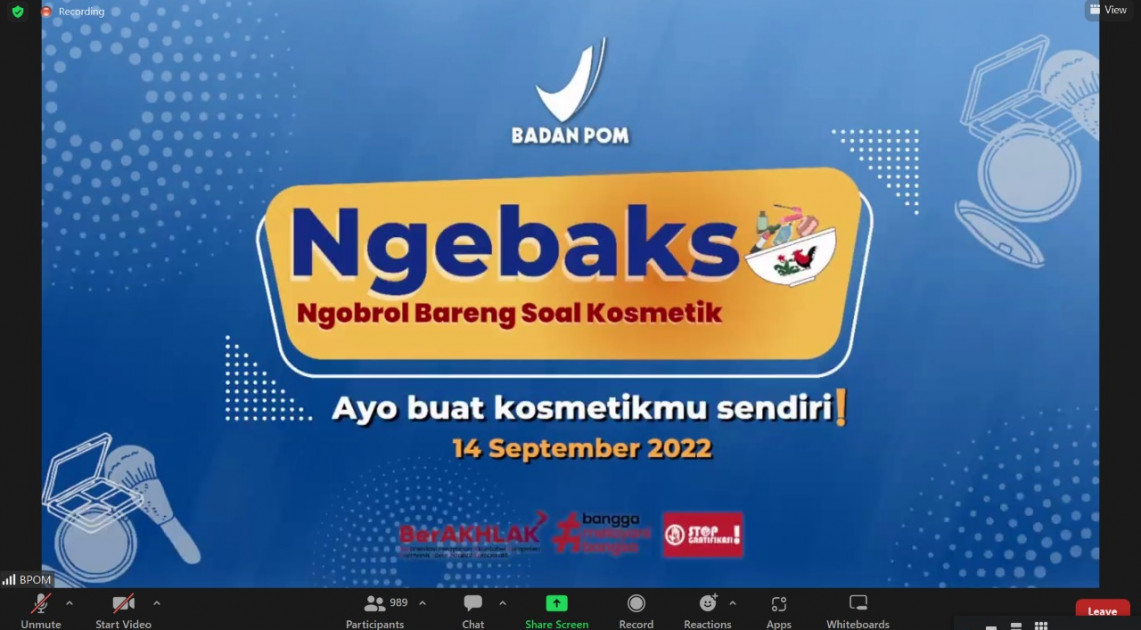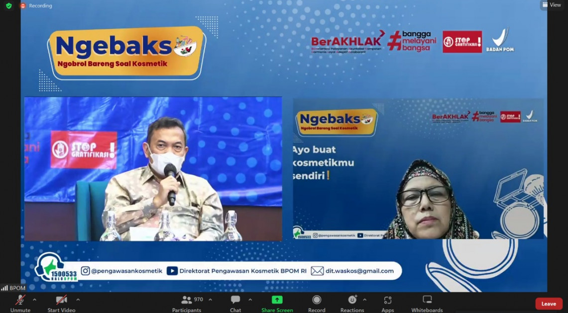 Jakarta – BPOM terus berupaya dalam memberikan edukasi dan meningkatkan awareness masyarakat termasuk penggunaan dan produksi kosmetika yang baik. Semua orang dapat menjadi pengusaha kosmetika. Munculnya pengusaha-pengusaha kosmetika lokal baru yang akan berdampak langsung dalam pertumbuhan perekonomian Indonesia. Salah satu bentuk edukasi yang dilakukan kali ini dengan menyelenggarakan kegiatan webinar series“NGEBAKSO (Ngobrol Bareng Soal Kosmetik)” secara hybrid.
