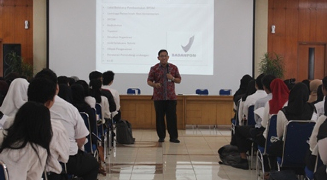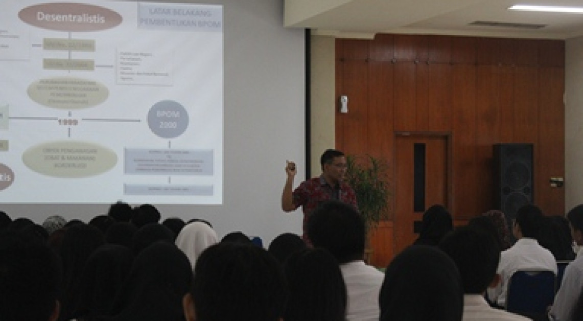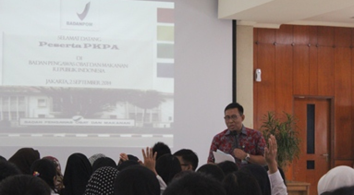 Bertempat di Gedung C Badan POM, Kepala Biro Hukum dan Humas, Budi Djanu Purwanto SH, MH., memberikan pemaparan singkat mengenai Badan POM, Tugas Pokok dan Fungsi Badan POM, serta informasi umum tentang Obat dan Makanan kepada peserta Praktek Kerja Profesi Apoteker (PKPA), 2 September 2014.