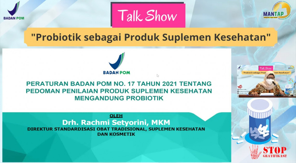 Dalam rangka memperkuat pengawasan di bidang obat tradisional dan suplemen kesehatan, meningkatkan kualitas pelayanan publik, serta menyesuaikan dengan perkembangan ilmu pengetahuan dan teknologi terkini, Badan POM mengadakan talkshow Sosialisasi Peraturan Badan POM Nomor 17 Tahun 2021 tentang Pedoman Penilaian Produk Suplemen Kesehatan Mengandung Probiotik, Kamis (07/10).