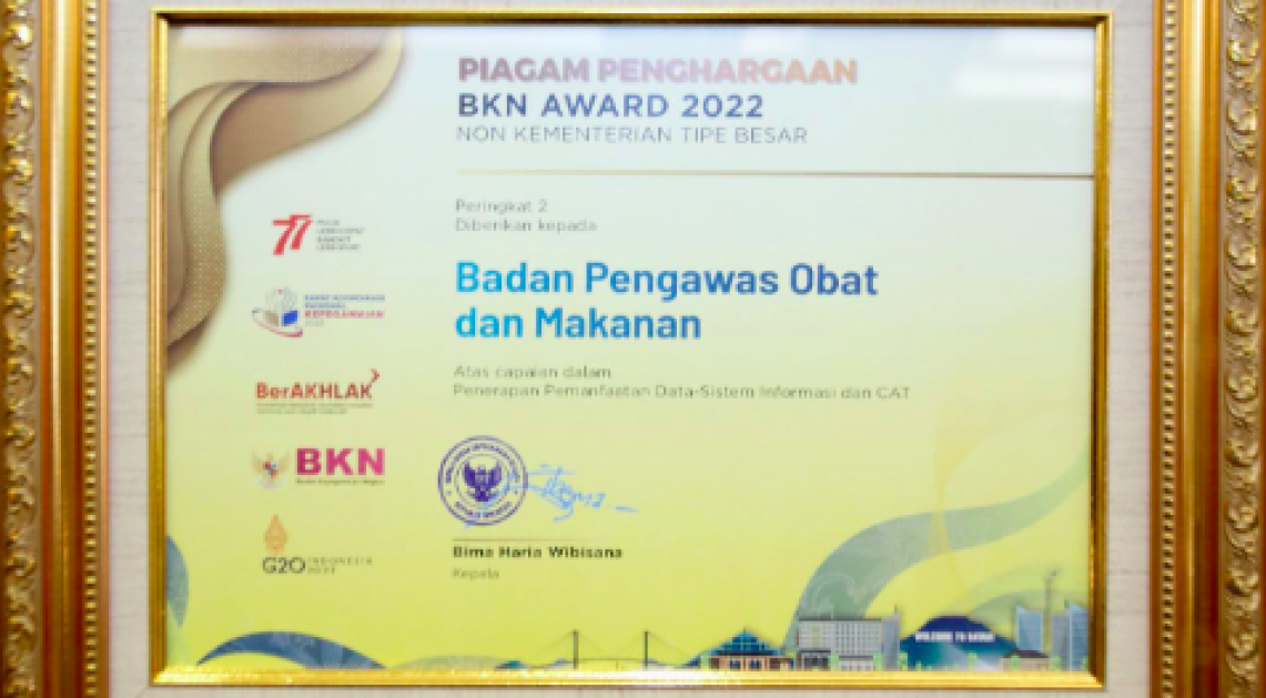 Jakarta - BPOM meraih dua penghargaan dalam ajang BKN Award 2022 yang digelar pada hari Senin (05/09/2022). Penghargaan yang diraih, yaitu Peringkat 1 Implementasi Penerapan Manajemen Kinerja dan Peringkat 2 Penerapan Pemanfaatan Data–Sistem Informasi dan Computer Assisted Test(CAT) untuk kategori Non-Kementerian Tipe Besar. Kepala BPOM RI, Penny K. Lukito menerima penghargaan tersebut secara langsung dari Kepala Badan Kepegawaian Negara (BKN), Bima Haria.