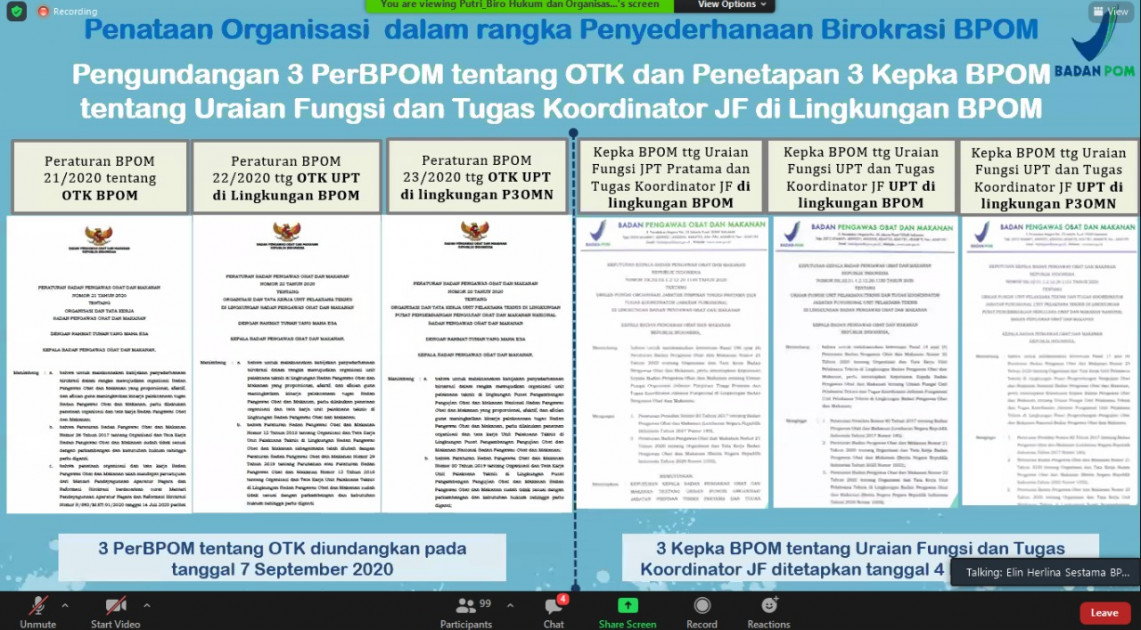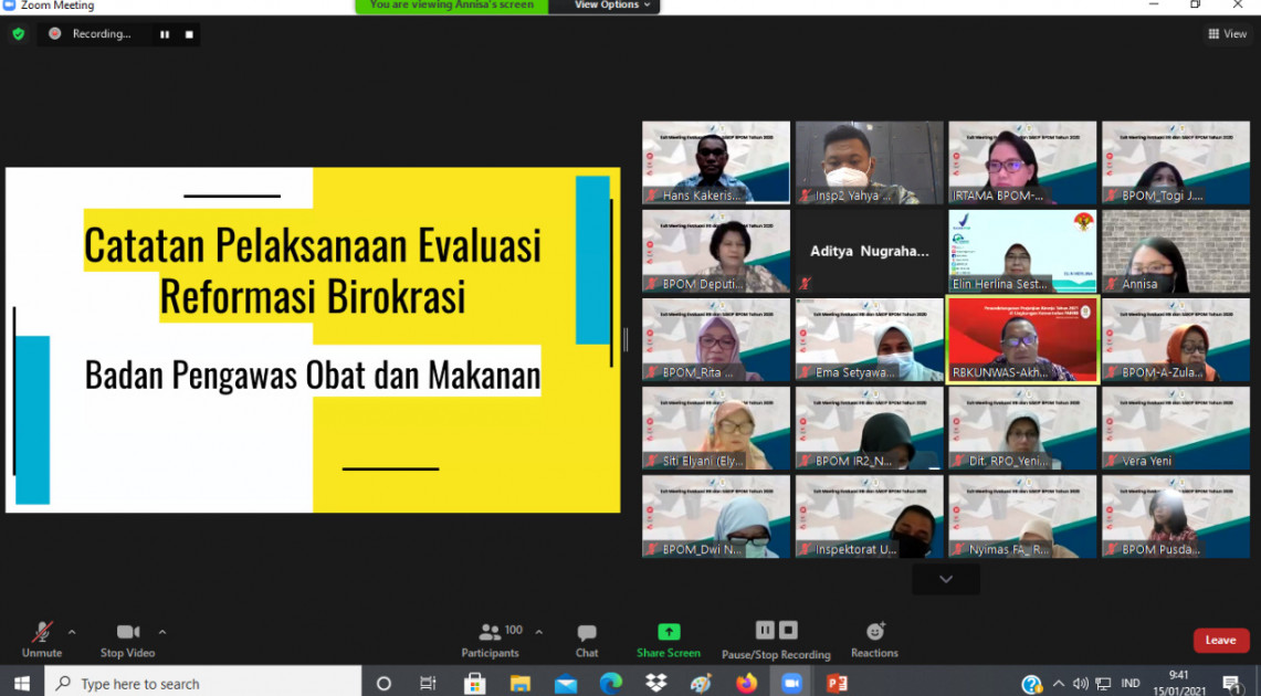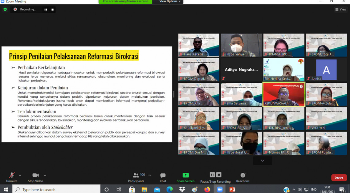 Jakarta – Kementerian Pendayagunaan Aparatur Negara dan Reformasi Birokrasi (KemenPANRB) memberikan rekomendasi terkait pelaksanaan Reformasi Birokrasi (RB) dan Sistem Akuntabilitas Kinerja Instansi Pemerintah (SAKIP) di lingkungan Badan POM tahun 2020 pada Exit Meeting yang dilaksanakan secara daring via zoom, Jumat (15/01).