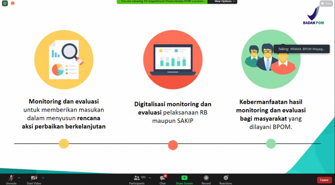 Kegiatan Exit Meeting ini diawali dengan pemaparan dari Badan POM yang diwakili oleh Sekretaris Utama Elin Herlina dan Inspektur Utama Mayagustina Andarini, kemudian dilanjutkan paparan dari KemenPANRB yang diwakili oleh Kedeputian Bidang Reformasi Birokrasi, Akuntabilitas, dan Pengawasan Kementerian PANRB, Akhmad Hasmy, serta ditutup dengan sesi diskusi.