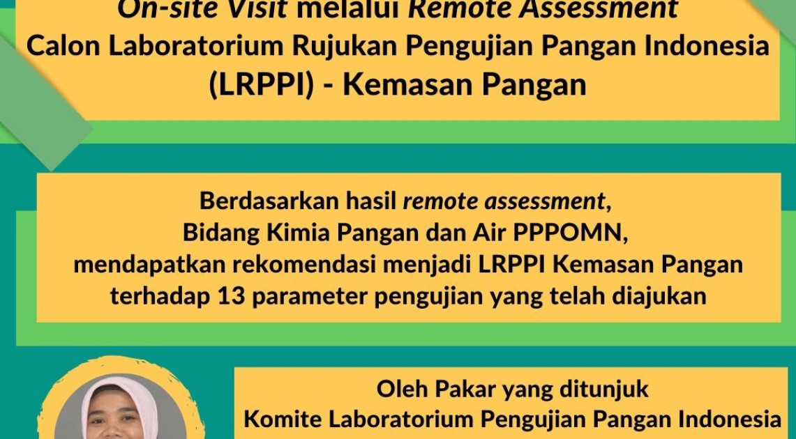 Jakarta. Pada tanggal 3 Juni 2020 telah diselenggarakan on-site visit melalui Remote Assessment Calon Laboratorium Rujukan Pengujian Pangan Indonesia (LRPPI) untuk Kemasan Pangan di Pusat Pengembangan Pengujian Obat dan Makanan Nasional (PPPOMN) Badan POM Bidang Kimia Pangan dan Air. Remote assessment ini dibuka oleh Kepala PPPOMN Mohamad Kashuri dan pakar yang ditunjuk oleh Komite Laboratorium Pengujian Pangan Indonesia (KLPPI), yaitu Endang Warsiki dari Fakultas Teknologi, Institut Pertanian Bogor (IPB).
