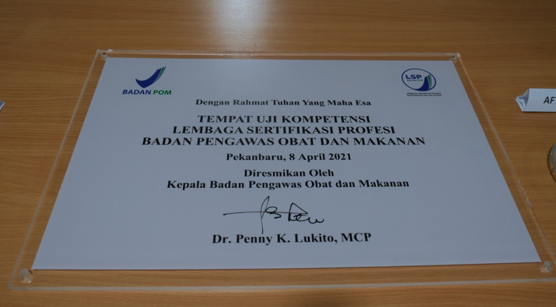 Pekanbaru – Kepala Badan POM meresmikan Tempat Uji Kompetensi (TUK) dari Lembaga Sertifikasi Profesi (LSP) Badan POM di Pekanbaru, Jumat (09/04). Bertempat di kantor Balai Besar POM di Pekanbaru, TUK ini menjadi yang pertama kali diresmikan oleh Badan POM. Peresmian ini menandakan komitmen Badan POM untuk mewujudkan SDM Pengawasan Obat dan Makanan di daerah agar memiliki kompetensi yang tinggi melalui sertifikasi yang dilakukan oleh LSP BPOM.