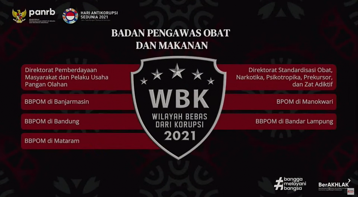 Predikat WBK/WBBM merupakan predikat yang diberikan kepada unit kerja pelayanan strategis yang pimpinan dan jajarannya mempunyai komitmen kuat untuk mewujudkan budaya kerja birokrasi yang anti-korupsi dan melayani publik dengan prima. Dengan pencapaian pada tahun 2021 ini, secara total di Badan POM terdapat 5 unit kerja yang telah meraih WBBM, dan 23 unit kerja telah meraih WBK. Hal ini membuktikan komitmen Badan POM dalam membangun Reformasi Birokrasi yang berkelanjutan untuk menciptakan pemerintahan yang baik dan bersih (HM-Hendriq).