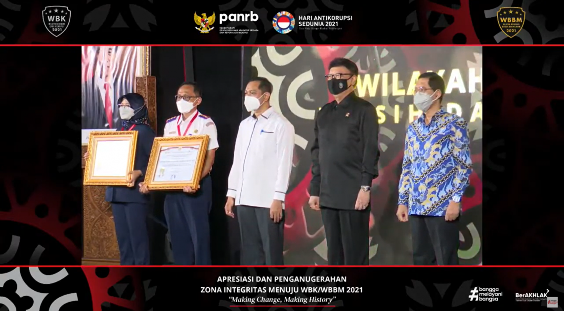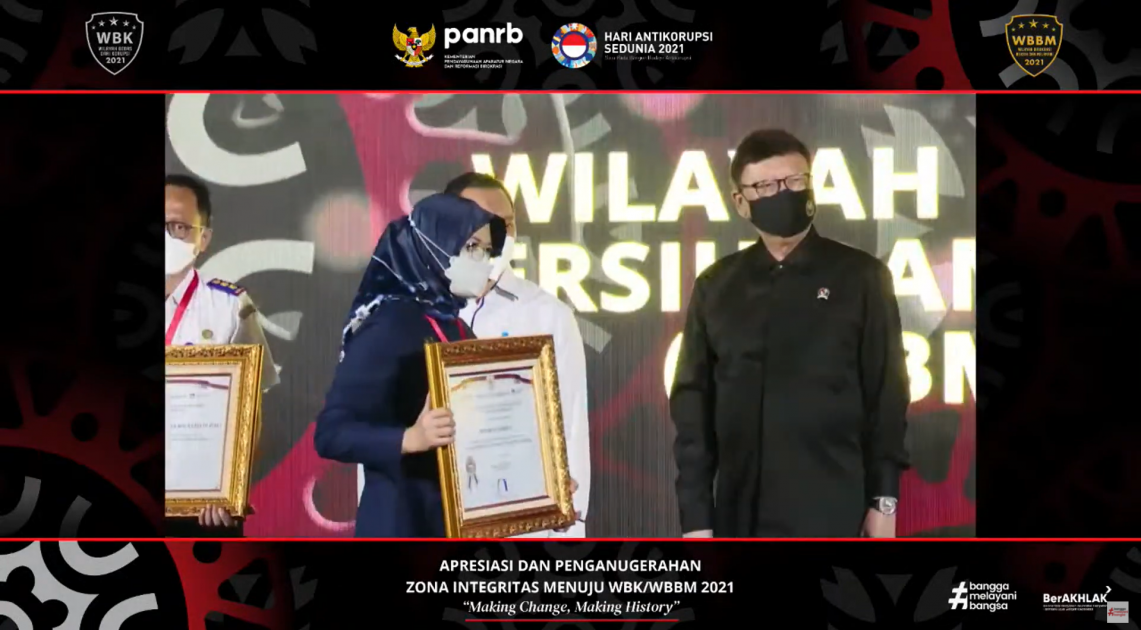 Jakarta – Sebanyak 11 unit kerja di Badan POM mendapatkan predikat Wilayah Bebas Korupsi (WBK)/Wilayah Birokrasi Bersih Melayani (WBBM) dari Kementerian Pendayagunaan Aparatur Negara dan Reformasi Birokrasi (Kemen PANRB), Senin (20/12/2021). Penghargaan ini diberikan secara langsung oleh Menteri PANRB, Tjahjo Kumolo dalam kegiatan Apresiasi dan Penganugerahan Zona Integritas Menuju WBK/WBBM Tahun 2021 di Jakarta dalam rangkaian peringatan Hari Anti Korupsi Sedunia.