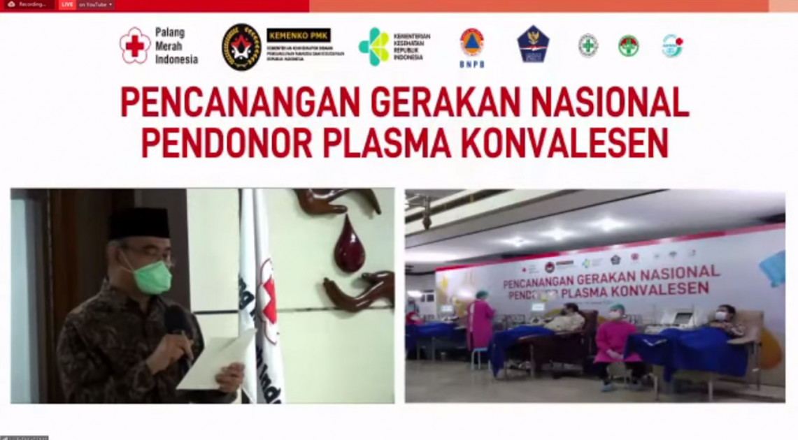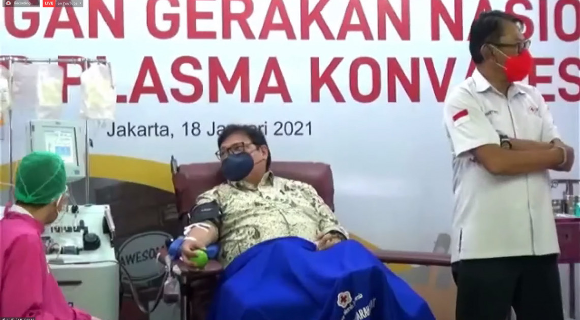 Senin (18/01) Palang Merah Indonesia (PMI) bersinergi dengan Kementerian Koordinator Bidang Pembangunan Manusia dan Kebudayaan (Kemenko PMK), Badan POM, Kementerian Kesehatan, dan Badan Nasional Penanggulangan Bencana (BNPB) menggelar acara Pencanangan Gerakan Nasional Pendonor Plasma Konvalesen. Kegiatan yang dilaksanakan secara daring dan luring ini dipimpin langsung oleh Wakil Presiden Ma’ruf Amin. Secara simbolis, pada kesempatan ini Menteri Koordinator Bidang Perekonomian Airlangga Hartarto menjadi orang pertama pendonor plasma konvalesen.