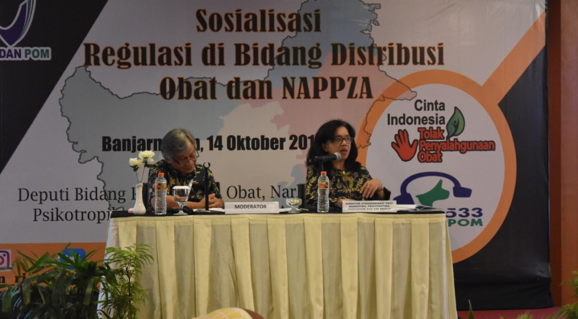 Kedeputian Bidang Pengawasan Obat, Narkotika, Psikotropika, Prekursor dan Zat Adiktif (NAPPZA) menyelenggarakan kegiatan Sosialisasi Regulasi di Bidang Distribusi Obat dan NAPPZA pada hari Senin tanggal 14 Oktober 2019 bertempat di Hotel Golden Tulip Galaxy, Banjarmasin. Acara ini merupakan rangkaian kegiatan sosialisasi regulasi yang dilaksanakan sebelumnya tanggal 9 September 2019 di Jakarta. Peserta sosialisasi adalah Apoteker Penanggung Jawab Pedagang Besar Farmasi (PBF) wilayah Kalimantan, perwakilan Gabungan Perusahaan Farmasi Indonesia (GPFI) wilayah Kalimantan, perwakilan Balai Besar POM di Banjarmasin, perwakilan unit di Kedeputian Bidang Pengawasan Obat dan NAPPZA serta Biro Hukum dan Organisasi, BPOM.