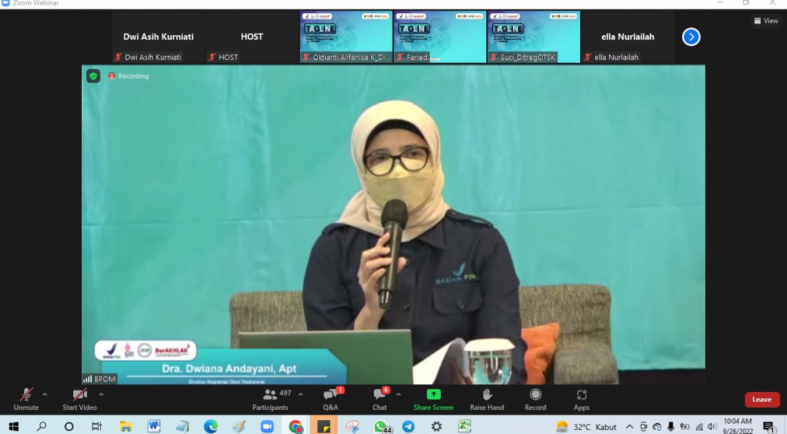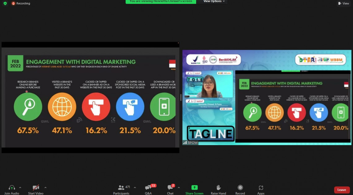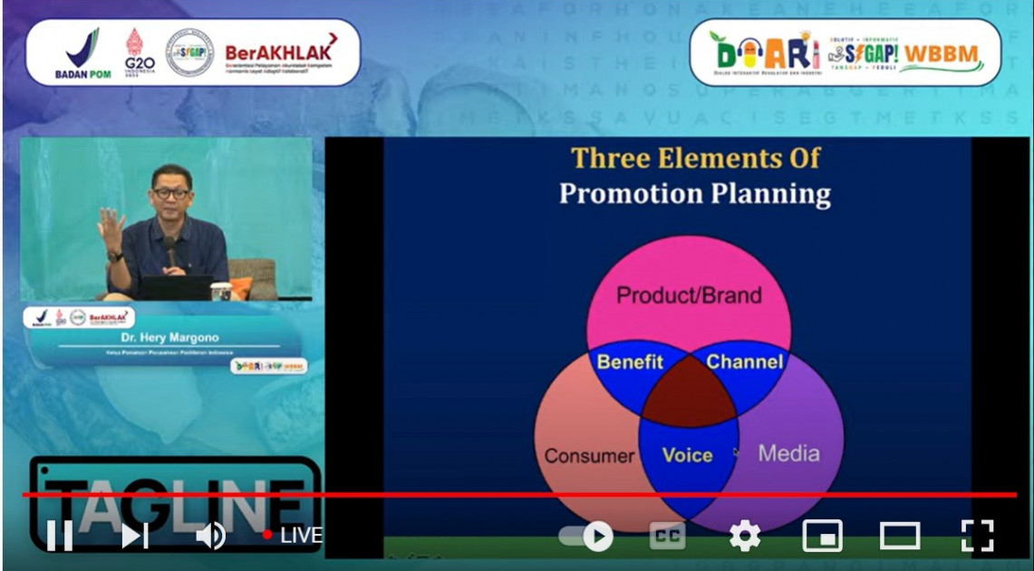 Bekasi - BPOM melalui Direktorat Registrasi Obat Tradisional, Suplemen Kesehatan, dan Kosmetik mengadakan kegiatan Coaching Clinic dalam bentuk Webinar Series pada Senin (26/09/2022). Tema yang diangkat dalam webinar kali ini adalah TAGLINE: Strategi Promosi yang Kreatif, Representatif, dan Efektif.