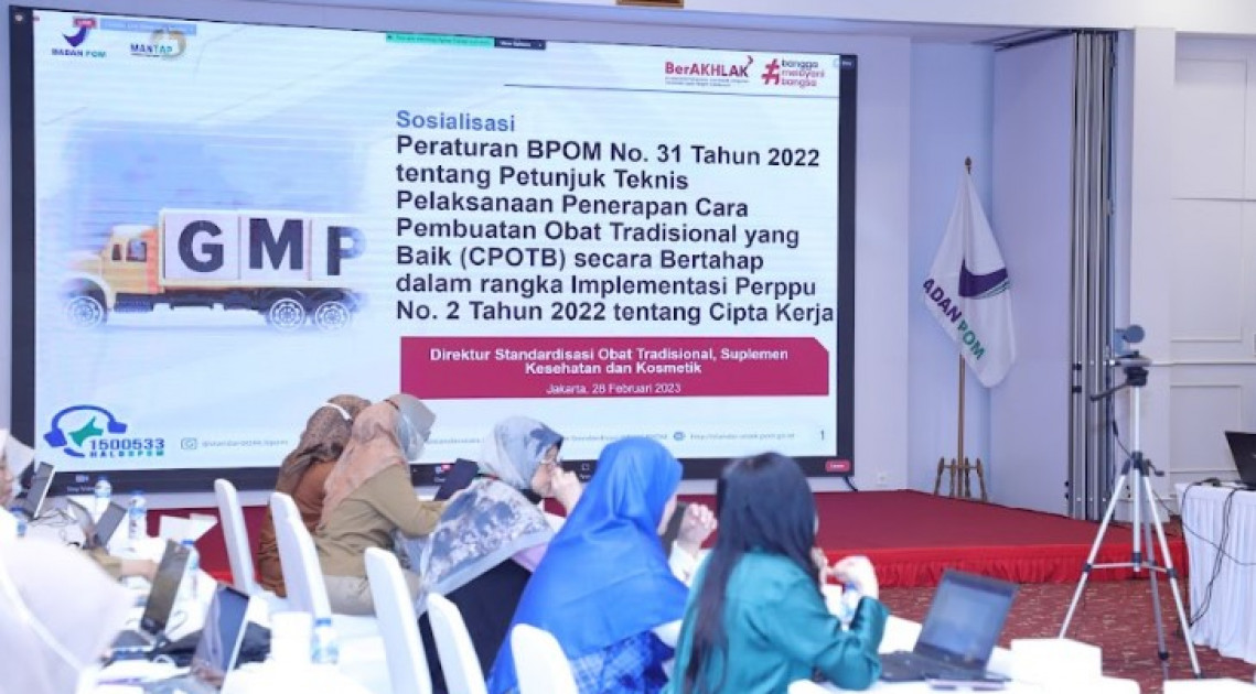 Jakarta – BPOM menyelenggarakan kegiatan Sosialisasi Peraturan BPOM Nomor 31 Tahun 2022 tentang Petunjuk Teknis Pelaksanaan Penerapan Aspek Cara Pembuatan Obat Tradisional yang Baik (CPOTB) secara bertahap secara hybrid, Selasa (28/02/2023). Tak hanya terkait CPOTB, Peraturan BPOM Nomor 34 Tahun 2022 tentang Pengawasan Periklanan Obat Tradisional, Obat Kuasi, dan Suplemen Kesehatan turut disosialisasikan dalam rangka Implementasi Peraturan Pemerintah Pengganti Undang-Undang (Perpu) Nomor 2 Tahun 2022 tentang Cipta Kerja.