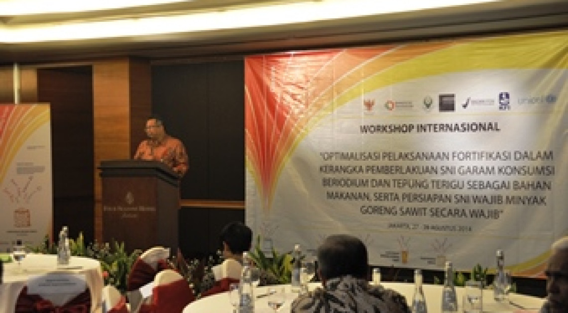 Dalam rangka meningkatkan efektivitas pelaksanaan fortifikasi wajib di Indonesia sebagai bagian dari implementasi Peraturan Presiden No. 42 Tahun 2013 tentang Gerakan Nasional Percepatan pergerakan Gizi, pada tanggal 27-28 Agustus 2014 telah dilaksanakan "Workshop Internasional: Optimalisasi Pelaksanaan Fortifikasi dalam Kerangka Pemberlakuan SNI Garam Konsumsi Beriodium dan Tepung Terigu sebagai Bahan Makanan, serta Persiapan SNI Minyak Goreng Secara Wajib" di Jakarta.