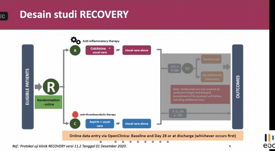 Dalam waktu dekat, studi RECOVERY ini akan dilakukan di Indonesia dan dikepalai oleh tim dari Fakultas Kedokteran Universitas Indonesia (FKUI) sebagai peneliti utama. Studi akan diawali dengan evaluasi terhadap penggunaan Aspirin dan Kolkisin sebagai salah satu pilihan terapi COVID-19 yang sudah tersedia dan terjangkau. Pada hari Jumat (19/02), konferensi pers mengenai pelaksanaan Studi RECOVERY di Indonesia telah digelar untuk mempublikasikan mengenai rencana studi tersebut.