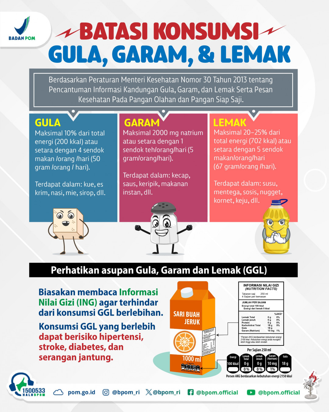 Perhatikan kandungan Gula, Garam dan Lemak (GGL) yang terkandung di dalamnya yaa.. Jangan sampai kamu melebihi batas konsumsi GGL yang disarankan dalam sehari.