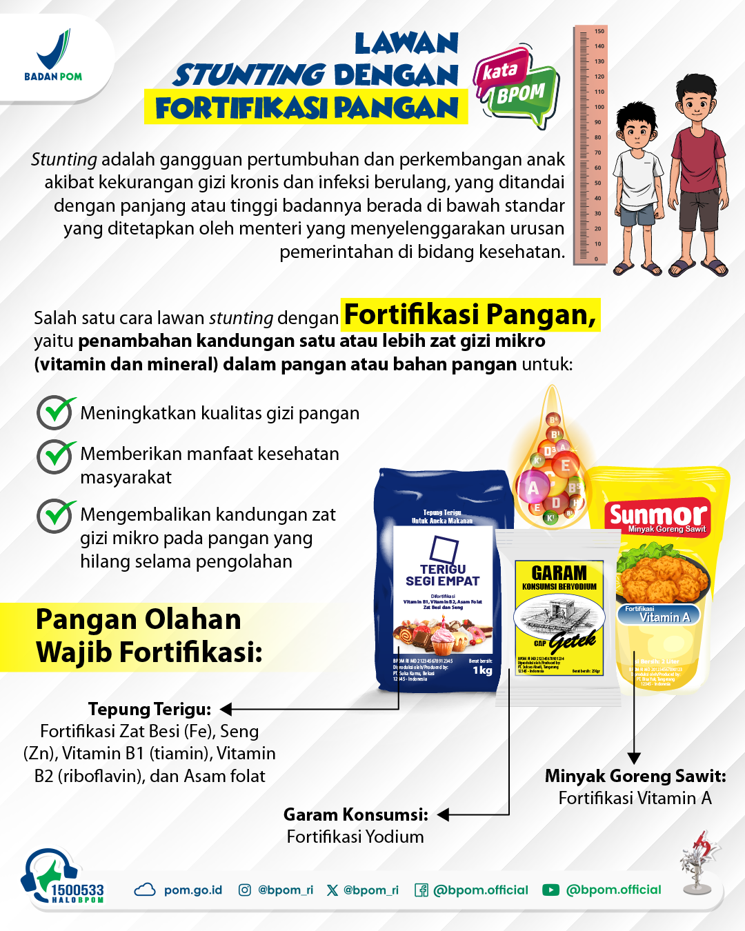 #SahabatBPOM, tahukah kamu, salah satu upaya mengatasi masalah gizi nasional termasuk stunting adalah fortifikasi pangan pada garam, tepung terigu dan minyak goreng sawit.
