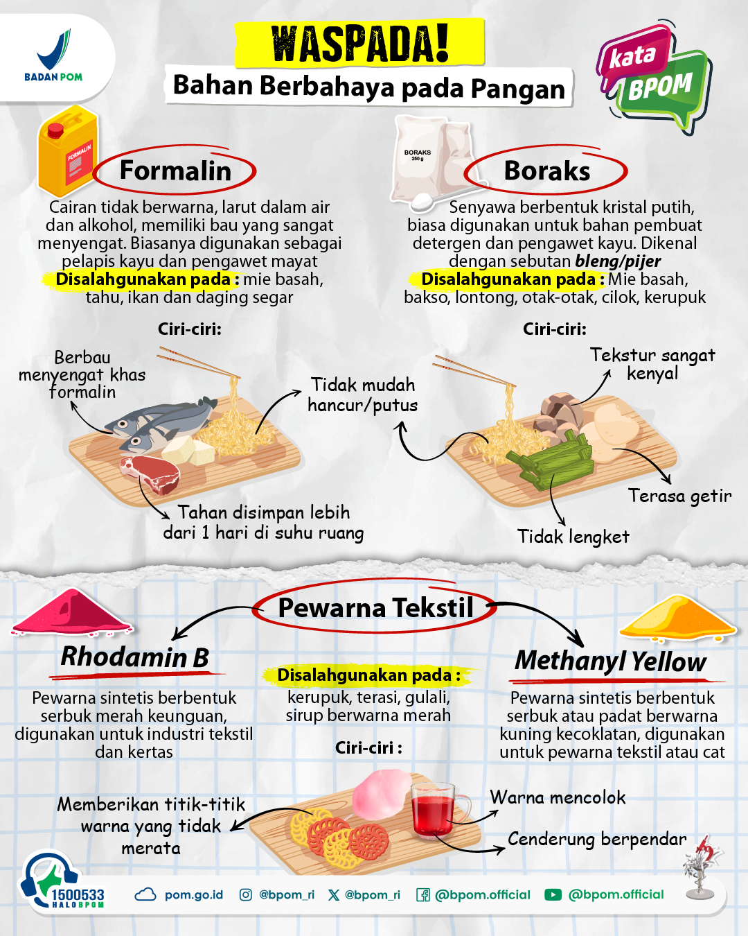 #SahabatBPOM, tahukah kamu ciri-ciri pangan yang mengandung bahan berbahaya seperti boraks, formalin, dan pewarna tekstil?