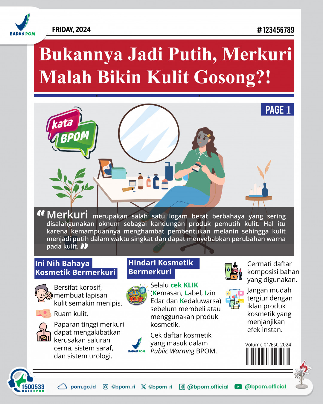Hai #SahabatBPOM, saat ini penggunaan kosmetik semakin meluas. Wajah cantik dan berseri menjadi idaman banyak wanita. Berbagai cara dilakukan, termasuk menggunakan kosmetik bermerkuri yang menjanjikan hasil instan. Padahal, merkuri sangat berbahaya bagi kesehatan.